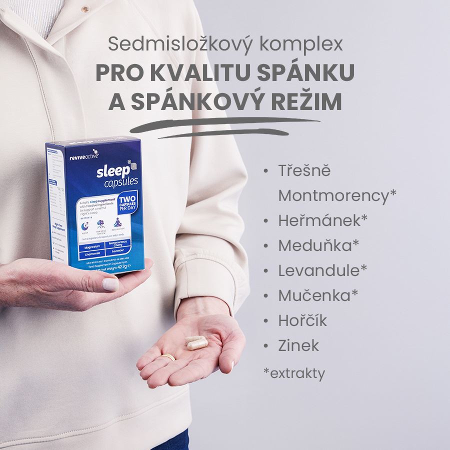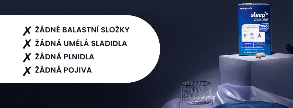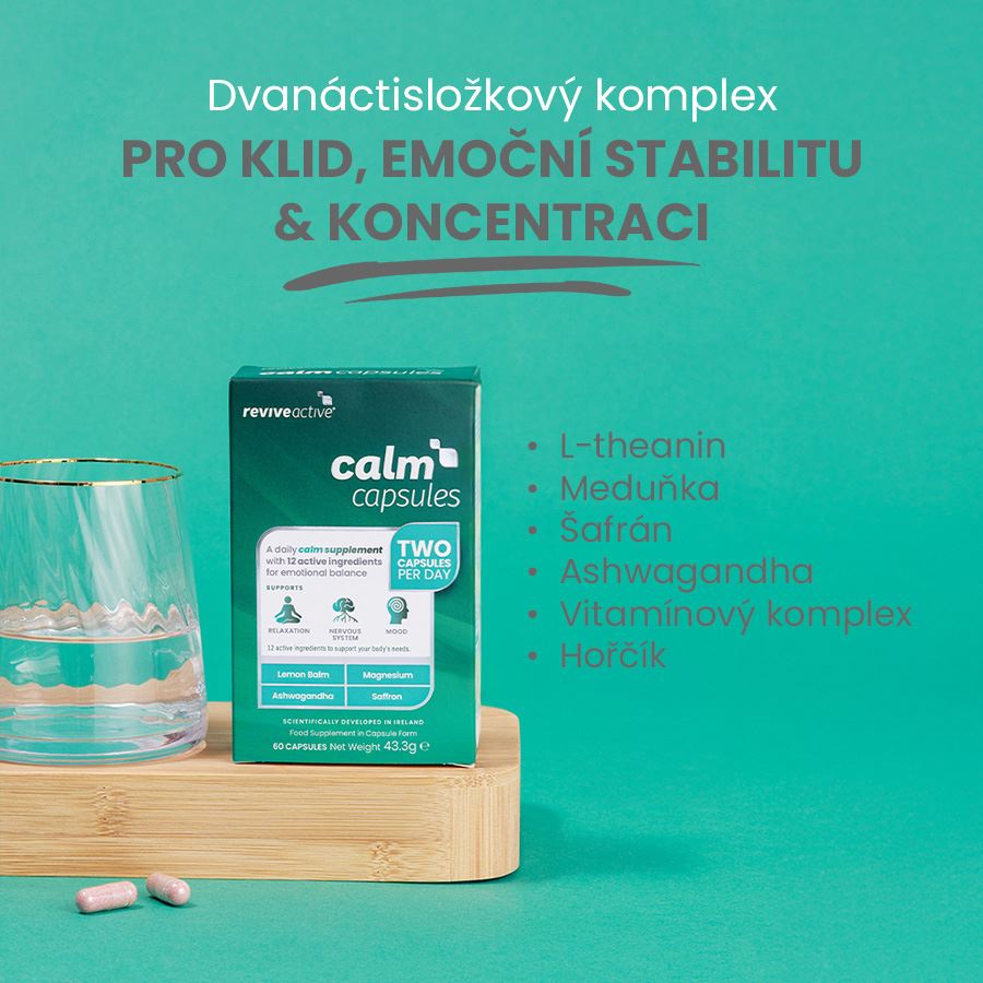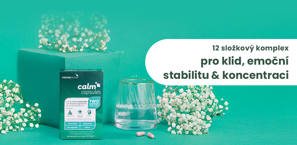 CALM & SLEEP Doplňky stravy. Vše pro soustředění, koncentraci a kvalitu spánku v jednom balíčku. Ultimátní kombinace produktů pro maximální možnou podporu. (Calm = relaxace a soustředění, Sleep = kvalita spánku) CALM Doplněk stravy. Vědecky podložený doplněk stravy pro klid, emoční stabilitu a koncentraci s obsahem dvanácti přesně cílených složek pečlivě vybraných od prověřených a celosvětově uznávaných producentů. Žádné balastní složky, umělá sladidla a pojiva. Calm byl vyvinut špičkovými odborníky a farmaceuty a to s cíleným požadavkem na nejvyšší možnou sílu a využitelnost jednotlivých složek, které vzájemně umocňují svůj účinek. ZAMĚŘENÍ PRODUKTU Relaxace Nervový systém Nálada L-theanin 200 mg - aminokyselina vyskytující se například v zeleném čaji, pro koncentraci a zklidnění. Extrakt z listů meduňky (10:1) 300 mg - prověřená rostlinná složka, pro zklidnění a koncentraci. Extrakt z květů šafránu 30 mg - unikátní rostlinná složka přinášející stabilitu, pro emoční stabilitu a psychickou kondici. Extrakt z kořene ashwagandhy (10:1) 300 mg - dobře známý adaptogen, pro odolnost a stabilitu. Vitamín B2 (riboflavin 5'fosfát) 2,8 mg - bioaktivní forma vitamínu, podpora nervové soustavy. Vitamín B3 (niacinamid) 16 mg - podpora nervové soustavy. Vitamín B6 (Pyridoxin hydrochlorid) 8,4 mg - podpora nervové soustavy. Vitamín B12 (Methylkobalamin) 10 µg - podpora nervové soustavy. Kyselina listová (kalcium L-methylfolát) 200 µg - bioaktivní forma, podpora nervové soustavy. Vitamín D3 (cholekalciferol) 10 µg / 400 IU - podpora obranného štítu a psychického stavu. Vitamín C (kyselina L-askorbová) 80 mg - podpora obranného štítu a proti oxidativnímu stresu. Hořčík (bisglycinát hořečnatý) 100 mg - chelátová forma, podpora nervové soustavy. * Biologicky aktivní složky ve 2 kapslích ULTIMÁTNÍ DOPLNĚK STRAVY Calm je ve své kategorii ultimátní doplněk stravy, který má okamžitý i dlouhodobý účinek. Produkt je speciálně sestavený pro vytížené jedince vystavené nadměrnému psychickému stresu, emočně náročnému stresu nebo pro každého, kdo má problémy s koncentrací. Lze jej užívat během dne - zklidňuje, ale neuspává. Je vhodný pro všechny věkové skupiny, lze jej užívat při zaměstnání nebo kdykoli, kdy je třeba dodat pocit klidu, pohody a zesílit koncentraci. Calm obsahuje L-theanin a extrakt z listů meduňky pro okamžitý účinek (během hodiny), extrakt z květů šafránů a extrakt z kořene ashwagandhy pro dlouhodobý účinek. Calm dále obsahuje B komplex s obsahem bioaktivního koenzymu vitamínu B2, kyselina listovou ve formě bioaktivního folátu a hořčík v organické formě bisglycinátu hořečnatého. Vitamíny a hořčík účinkují střednědobě až dlouhodobě. To vše bez obsahu nežádoucích a balastních aditiv v každé kapslí! V případě potřeby optimální podpory spánku je možné Revive Active Calm kombinovat s produktem Revive Active Sleep, který je speciálně sestaven pro optimální relaxaci a spánek. JAK UŽÍVAT CALM Užívejte 2 kapsle denně Užívejte před nebo spolu s jídlem Lze užívat kdykoli během dne Povolená zdravotní tvrzení podle Nařízení Evropské komise č. 432/2012 Riboflavin přispívá k normální činnosti nervové soustavy / Niacin přispívá k normální činnosti nervové soustavy / Niacin přispívá k normální psychické činnosti / Vitamin B6 přispívá k normální činnosti nervové soustavy / Vitamin B6 přispívá k normální psychické činnosti / Vitamin B6 přispívá k regulaci hormonální aktivity / Vitamin B12 přispívá k normální činnosti nervové soustavy / Vitamin B12 přispívá k normální psychické činnosti / Folát přispívá k normální psychické činnosti / Vitamin C přispívá k normální psychické činnosti / Hořčík přispívá k normální činnosti nervové soustavy / Hořčík přispívá k normální psychické činnosti SLEEP Doplněk stravy. Superdoplněk stravy pro kvalitu spánku a spánkový režim s obsahem sedmi přesně cílených složek pečlivě vybraných od prověřených a celosvětově uznávaných producentů. Žádné balastní složky, umělá sladidla a pojiva. Sleep byl vyvinut špičkovými odborníky a farmaceuty a to s cíleným požadavkem na nejvyšší možnou sílu a využitelnost jednotlivých složek, které vzájemně umocňují svůj účinek. ZAMĚŘENÍ PRODUKTU Spánek Nervový systém Relaxace Třešeň Montmorency (extrakt 10:1) 450 mg - přirozený zdroj melatoninu a antioxidantů. Heřmánek (extrakt z květů) 300 mg - obsahuje látku zvanou apigenin související s GABA (kyselinou gama aminomáselnou). Meduňka (extrakt z listů) 100 mg - zdroj kyseliny rozmarýnové, flavonoidů a triterpenů, účinek souvisí s GABA. Levandule (extrakt z květů) 50 mg - zdroj kyseliny rozmarýnové, flavonoidů a kumarinů, účinek souvisí s GABA. Mučenka 50 mg - obsahuje látku zvanou apigenin související s GABA. Bisglycinát hořečnatý 100 mg - organická forma hořčíku, pozitivně ovlivňuje nervovou soustavu. Glukonát zinečnatý 7,5 mg - organická forma zinku, působí jako antioxidant. * Biologicky aktivní složky ve 2 kapslích ULTIMÁTNÍ DOPLNĚK STRAVY Sleep je ve své kategorii ultimátní doplněk stravy, který má okamžitý i dlouhodobý účinek. Produkt je sestavený speciálně pro jedince, kteří mají problémy se spánkem v krátkodobém i dlouhodobém horizontu. Podporuje klidný spánek, spánkový rytmus i nervovou soustavu. Třešeň Montmorency je přirozeným zdrojem melatoninu, který má vlastnosti související s cirkadiánním rytmem. Všech sedm obsažených složek pak má podobné účinky související s nervovou soustavou. Na rozdíl od konvenčních léků na těchto složkách nevzniká návyk. To vše 