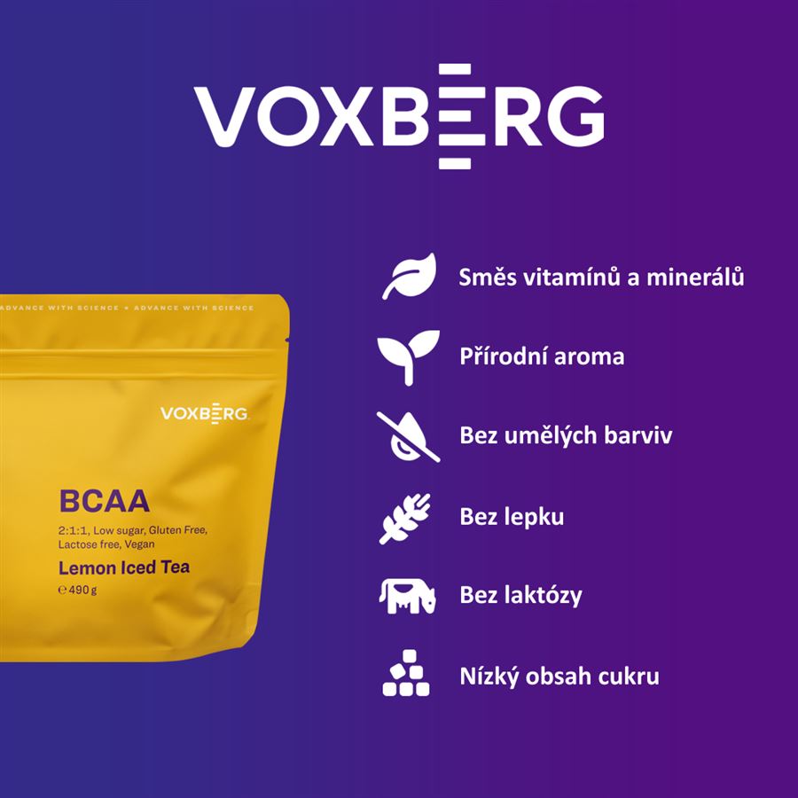 BCAA Doplněk stravy se sladidlem. Aminokyseliny leucin, isoleucin a valin v poměru 2:1:1. Aminokyseliny s větveným řetězcem (leucin, izoleucin a valin) výrazně podporují fyzický výkon, regeneraci a růst svalů. Proč přidaný leucin? Konkrétně tato aminokyselina má vlastnosti související s aktivací signální cesty mTOR, která je spouštěčem proteosyntézy. BCAA v bodech: - Esenciální aminokyseliny - tělo si je nedokáže samo vytvořit, proto je třeba je dodávat ve stravě nebo v doplňcích stravy.- Optimální poměr 2:1:1 - V našich BCAA je přesně vyvážený poměr všech tří látek pro nejlepší možnou podporu vašeho výkonu, regenerace a růstu svalů.- Pomocník při regeneraci - na rozdíl od jiných aminokyselin jsou všechny tři BCAA metabolizovány přímo ve svalech, kterým poskytují palivo pro výkon a regeneraci.- Nejkvalitnější suroviny - bílkoviny používané k výrobě BCAA pocházejí převážně z Evropské Unie a jejich kvalita je přísně kontrolována.- Chutná skvěle - na chuti našich výrobků nám opravdu záleží. Proč Voxberg? - Prémiová slovenská značka - Přímý výrobce - vlastní vývoj a výzkum- Reschers Food Innovations - spolupráce s prestižními institucemi- Nejnovější vědecké poznatky v praxi- IFS certifikace a autorizace- Kontrola celého výrobního procesu- Využití surovin s nejvyšším ratingem Balení: 490 g Dávkování: 7 g prášku (1 odměrku) smíchejte s 300 ml vody (doporučuje se studená), protřepejte minimálně po dobu 15 až 20 sekund a vypijte. Balení obsahuje 70 dávek. Upozornění: Nevhodné pro děti, těhotné a kojící ženy. Nevhodné pro fenylketonuriky. Nevhodné pro osoby alergické (přecitlivělé) na některé z látek uvedených ve složení produktu. Nezapomínejte na význam pestré a vyvážené stravy. Může obsahovat lepek, vejce, sóju, sezam, arašídy a skořápkové plody. Aktivní látky: v 7 g* BCAA 5,5 g L-leucin 2,9 g L-isoleucin 1,3 g L-valin 1,9 g *7 g odpovídá jedné dávce (1 odměrce) Složení v 7 g: L-leucin 2,9 g, L-isoleucin 1,3 g, L-valin 1,3 g, barvivo: karamel, přírodní aromata, vláknina z čekanky, regulátor kyselosti: kyselina citronová, sladidlo: sukraloza.