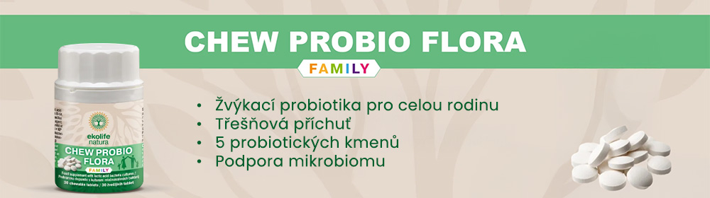 CHEW PROBIO FLORA FAMILY Doplněk stravy - Žvýkací probiotika pro celou rodinu- Třešňová příchuť- 5 probiotických kmenů- Podpora mikrobiomu Chew Probio Flora jsou žvýkací probiotika pro celou rodinu - pro děti i dospělé. Celkem 5 probiotických kmenů - Lactobacillus rhamnosus GG, Bifidobacterium laktis Bl-04, Lactobacillus plantarum Lp-115, Bifidobacterium laktis HN019 a Lactobacillus acidophilus NCFM ve snadno konzumovatelné formě žvýkacích dražé. Chew Probio Flora Family - snadno uživatelná probiotika, která zachutnají dětem i celé rodině! Produkt je vhodný pro všechny jedince zaměřené na: - Podporu mikrobiomu- Podporu zažívacího traktu- Podporu obranného štítu O ZNAČCE EKOLIFE NATURA Ekolife Natura je velmi dynamická a úspěšná společnost ze Slovinska, specializující se na prémiové lipozomální vitamíny, lipozomální chelatované minerály a lipozomální formulace nutrientů prověřené klinickými studiemi. Společnost založily v roce 2007 výživové specialistky, sestry Tjaša a Tajča Pavček. Obrovskou motivací je jim zájem o zdravý životní styl, vzdělávání se, sdílení informací a především to, že jsou obě maminky tří dětí. Před tvorbou každého nového produktu se proto ptají – daly bychom ho i svým dětem? Lepší záruku kvality bychom nenašli. Lipozomální vitamíny od Ekolife Natura jsou naprostou špičkou z hlediska vstřebatelnosti a využitelnosti tělem. Unikátní technologie lipozomů umožňuje transportovat účinné látky přímo k buňkám, takže vitamíny dosahují v těle maximálního možného účinku. Balení: 30 tablet (19,5 g) Dávkování: 1 tableta denně. Tabletu můžete rozžvýkat nebo nechat jen rozpustit v ústech. Upozornění: Nepřekračujte doporučenou denní dávku. Není náhrada pestré stravy. Skladujte v chladu, suchu, mimo dosah dětí a přímého slunce. Aktivní látky: v 1 tabletě Lactobacillus rhamnosus GG 3 mg Bifidobacterium lactis BI-04 2,5 mg Lactobacillus plantarum Lp-115 2,5 mg Bifidobacterium lactis HN019 2,5 mg Lactobacillus acidophillus NCFM 2,5 mg Složení v 1 tabletě: sladidlo sorbitol, sladidlo isomalt, kyselina jablečná (zvýrazňovač chuti), Lactobacillus rhamnosus GG 3 mg, Bifidobacterium lactis BI-04 2,5 mg, Lactobacillus plantarum Lp-115 2,5 mg, Bifidobacterium lactis HN019 2,5 mg, Lactobacillus acidophillus NCFM 2,5 mg, třešňové aroma, protispékavá látka stearan hořečnatý. Jedna tableta obsahuje celkem 5,5 x 109 kolonií tvořících jednotek.