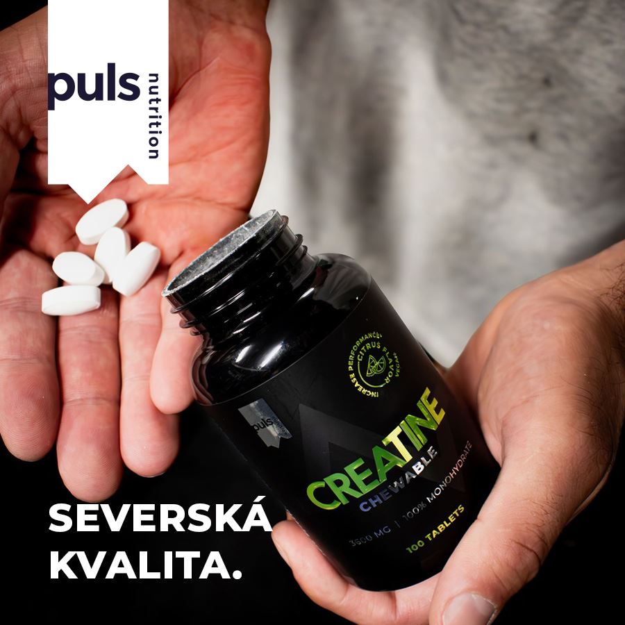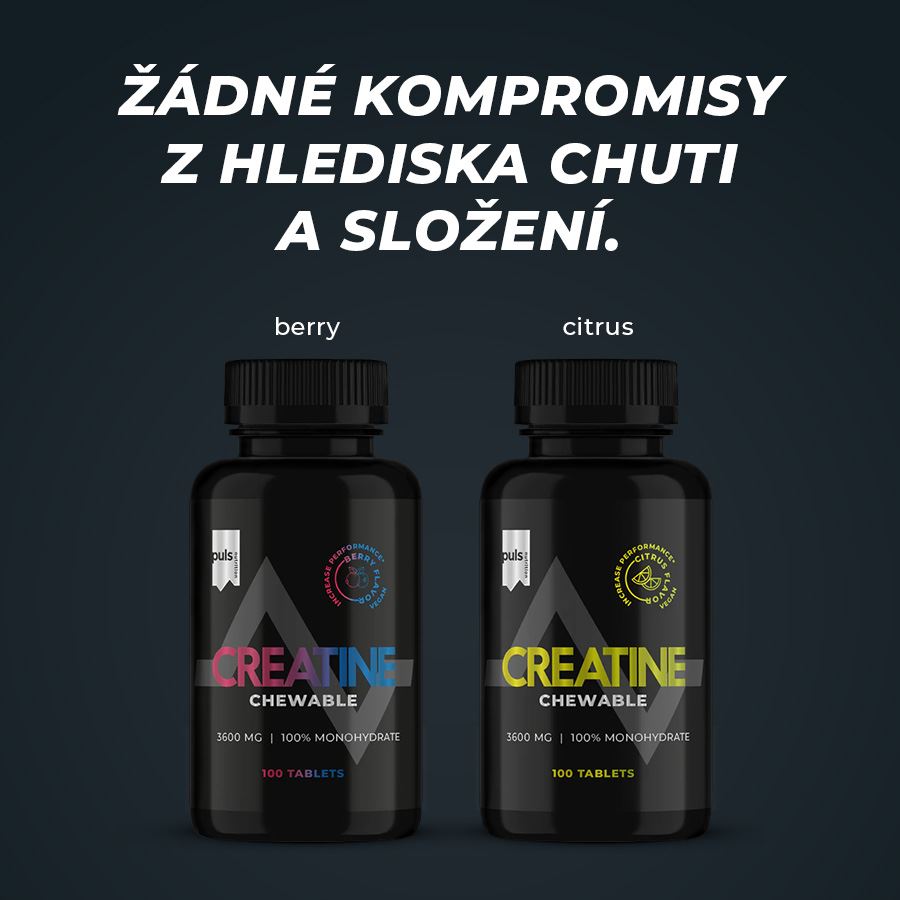CREATINE CHEWABLEDoplněk stravy. SEVERSKÁ KVALITA BEZ KOMPROMISU Zvyšte svou sílu a výkon se žvýkacími kreatinovými tabletami – pohodlným a chutným způsobem, jak podpořit svůj trénink. Každá dávka poskytuje ověřené 3 g kreatin monohydrátu, u něhož bylo vědecky prokázáno, že zlepšuje fyzický výkon. Pravidelné užívání pomáhá budovat čistou svalovou hmotu, zlepšuje regeneraci mezi sériemi a zvyšuje celkovou tréninkovou kapacitu – díky tomu můžete trénovat tvrději a postupovat rychleji. Tyto osvěžující tablety s citrusovou příchutí odstraňují nutnost míchání prášků a výrazně usnadňují užívání doplňků kdekoliv – v posilovně, v práci nebo na cestách. Kreatin zlepšuje fyzický výkon při opakovaných krátkodobých, vysoce intenzivních cvičeních. Tohoto účinku je dosaženo při denní dávce 3 g. Kreatin se přirozeně vyskytuje v lidském těle a funguje jako rychlý zdroj energie při svalových kontrakcích. Jeho pravidelná suplementace v cyklech je prokázanně účinná pro zvýšení tréninkového výkonu. Pro optimální rozvoj síly a výkonu doporučujeme kombinovat kreatin s našimi kvalitními syrovátkovými nebo veganskými proteiny, které podpoří komplexní růst svalů a regeneraci. Žádné kompromisy z hlediska jedinečné chuti a složení. Finská značka PULS NUTRITION patří ve všech ohledech k absolutní špičce sportovní a doplňkové výživy. Severská kvalita Žádné starosti s mícháním prášku Maximalizuje růst svalů Zvyšte tréninkovou kapacitu Podpora pro vysoce intenzivní tréninky Trénujte tvrději a postupujte rychleji 3g kreatin monohydrátu / 4 tablety Bez cukru Vhodné pro vegany Lahodná příchuť lesní plody PULS NUTRITION - FUEL FOR THE PASSIONATE ONES O značce Inspirujeme naše zákazníky, aby v každodenním životě dělali ta nejlepší rozhodnutí. PULS vznikl ve Finsku z potřeby skloubit hektický a aktivní životní styl se zdravou a výživnou stravou. V PULS věříme, že sportovní výživa a nápoje nejsou určeny jen vrcholovým sportovcům. Pokud se používají správně, mohou fyzicky i psychicky prospět každému, kdo potřebuje v běžném dni trochu povzbuzení nebo energetický přísun. Naše poslání Naším posláním je dodávat životu energii prostřednictvím sportovní výživy. Nabízíme chutné a funkční produkty navržené tak, aby podpořily a pomohly naplno rozvinout váš potenciál. Naše hodnoty Kvalita je naší hlavní prioritou. Chuť - Naše produkty musí vždy skvěle chutnat. V tomto směru neděláme žádné kompromisy. Zdraví a benefity - Všechny naše produkty jsou zdravější volbou. Ne všechny jsou však bez obsahu cukru, bezlepkové či veganské — protože nejsme striktní a jsme ochotni ke kompromisu, pokud přináší přidanou hodnotu. Dostupnost - Naším cílem je, aby byly naše produkty snadno dostupné — ať už ve vašem místním obchodě, nebo pohodlně online. Dostupná cena - Za kvalitní produkty není nutné utrácet jmění. Chceme nabízet nejlepší poměr ceny a kvality na trhu, aniž bychom dělali kompromisy v oblasti kvality či bezpečnosti. Balení: 100 žvýkacích tablet (130 g). Dávkování: 4 žvýkací tablety denně. Upozornění: Uchovávejte v suchu a chladu, mimo dosah slunečního záření a dětí. Nepřekračujte doporučenou denní dávku. Nenahrazuje pestrou stravu. Může obsahovat stopy mléka, laktózy, sóji, lepku nebo vajec. Aktivní látky: ve 4 žvýkacích tabletách Kreatin monohydrát 3600 mg z toho kreatin 3168 mg Složení: kreatin monohydrát, stabilizátor mikrokrystalická celulóza, regulátor kyselosti kyselina DL-jablečná, sladidlo sukralóza, aromata, emulgátor hořečnaté soli mastných kyselin, protispékavá látka oxid křemičitý.