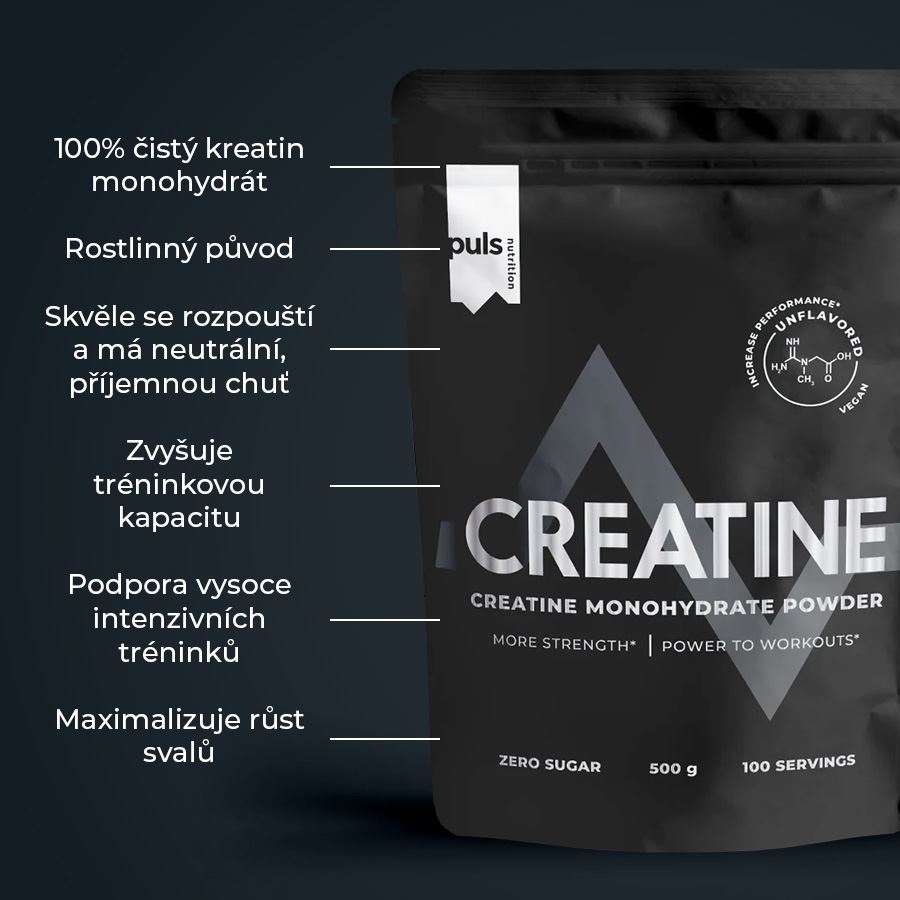 CREATINE MONOHYDRATEDoplněk stravy. SEVERSKÁ KVALITA BEZ KOMPROMISU Nezastavitelný progres. Maximalizujte svou sílu a výkon s naším 100% čistým, neochuceným kreatin monohydrátem. Tento vědecky ověřený doplněk výkonu zvýší intenzitu vašeho tréninku a pomůže vám naplno rozvinout váš potenciál. Prémiový, neochucený PULS Creatine dodává 5 g 100% čistého kreatin monohydrátu v jedné dávce. Pravidelné užívání pomáhá budovat čistou svalovou hmotu, zlepšuje regeneraci mezi sériemi a zvyšuje celkovou tréninkovou kapacitu – díky tomu můžete trénovat tvrději a dosahovat rychlejších pokroků. Kreatin zlepšuje fyzický výkon při opakovaných krátkodobých, vysoce intenzivních cvičeních. Účinku je dosaženo při denní dávce 3 g. Kreatin se přirozeně vyskytuje v lidském těle a slouží jako zásadní zdroj energie pro svalovou kontrakci. Jeho pravidelná suplementace v cyklech byla prokazatelně spojena se zvýšením tréninkového výkonu. Náš kreatinový prášek je zcela veganský, bez zbytečných přísad a snadno se míchá s vodou nebo džusem. Pro optimální rozvoj síly a výkonu kombinujte kreatin s našimi kvalitními Whey nebo Vegan Proteiny a podpořte tak komplexní růst svalů i regeneraci. Žádné kompromisy z hlediska jedinečné chuti, čistoty a složení. Finská značka PULS NUTRITION patří ve všech ohledech k absolutní špičce sportovní a doplňkové výživy. Severská kvalita 100% čistý kreatin monohydrát Rostlinný původ Skvěle se rozpouští a má neutrální, příjemnou chuť Zvyšuje tréninkovou kapacitu Podpora vysoce intenzivních tréninků Maximalizuje růst svalů Neochucený PULS NUTRITION - FUEL FOR THE PASSIONATE ONES O značce Inspirujeme naše zákazníky, aby v každodenním životě dělali ta nejlepší rozhodnutí. PULS vznikl ve Finsku z potřeby skloubit hektický a aktivní životní styl se zdravou a výživnou stravou. V PULS věříme, že sportovní výživa a nápoje nejsou určeny jen vrcholovým sportovcům. Pokud se používají správně, mohou fyzicky i psychicky prospět každému, kdo potřebuje v běžném dni trochu povzbuzení nebo energetický přísun. Naše poslání Naším posláním je dodávat životu energii prostřednictvím sportovní výživy. Nabízíme chutné a funkční produkty navržené tak, aby podpořily a pomohly naplno rozvinout váš potenciál. Naše hodnoty Kvalita je naší hlavní prioritou. Chuť - Naše produkty musí vždy skvěle chutnat. V tomto směru neděláme žádné kompromisy. Zdraví a benefity - Všechny naše produkty jsou zdravější volbou. Ne všechny jsou však bez obsahu cukru, bezlepkové či veganské — protože nejsme striktní a jsme ochotni ke kompromisu, pokud přináší přidanou hodnotu. Dostupnost - Naším cílem je, aby byly naše produkty snadno dostupné — ať už ve vašem místním obchodě, nebo pohodlně online. Dostupná cena - Za kvalitní produkty není nutné utrácet jmění. Chceme nabízet nejlepší poměr ceny a kvality na trhu, aniž bychom dělali kompromisy v oblasti kvality či bezpečnosti. Balení: 500 g Dávkování: smíchejte 5 g (cca 1 odměrka) s 200 ml vody nebo džusu. Konzumujte jednou denně, nejlépe před cvičením. V netréninkové dny ráno. Užívejte po dobu 4 týdnů, po té následuje 4-6 týdnů v užívání pauza. Balení obsahuje 100 dávek. Upozornění: Není náhrada pestré stravy. Nepřekračujte doporučenou denní dávku. Nenahrazuje pestrou stravu. Skladujte v suchu a chladu, mimo dosah dětí a přímého slunce. Zároveň s kreatinem neužívejte nápoje obsahující kofein. Může obsahovat stopy lepku, mléka, sóji, vajec a suchých skořápkových plodů. Složení: 100 % kreatin monohydrát.