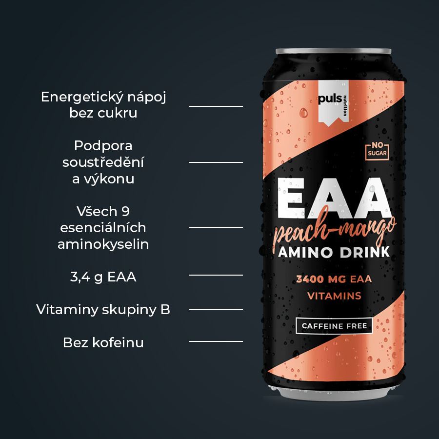 Funkční Amino Energy. Energie a výkon s broskvovo-mangovým nádechem – dopřejte si pořádnou vzpruhu s naším nejnovějším EAA nápojem. Tento energetický drink bez cukru a bez kofeinu obsahuje 3,4 g EAA a vitamíny skupiny B. Je navržen tak, aby podpořil výkon, vytrvalost a pomohl snížit únavu a vyčerpání. Vitamíny B6 a B12 podporují normální energetický metabolismus a přispívají ke snížení míry únavy a vyčerpání.