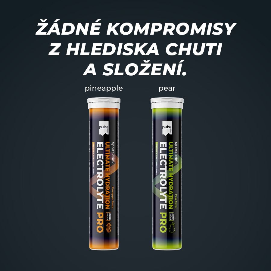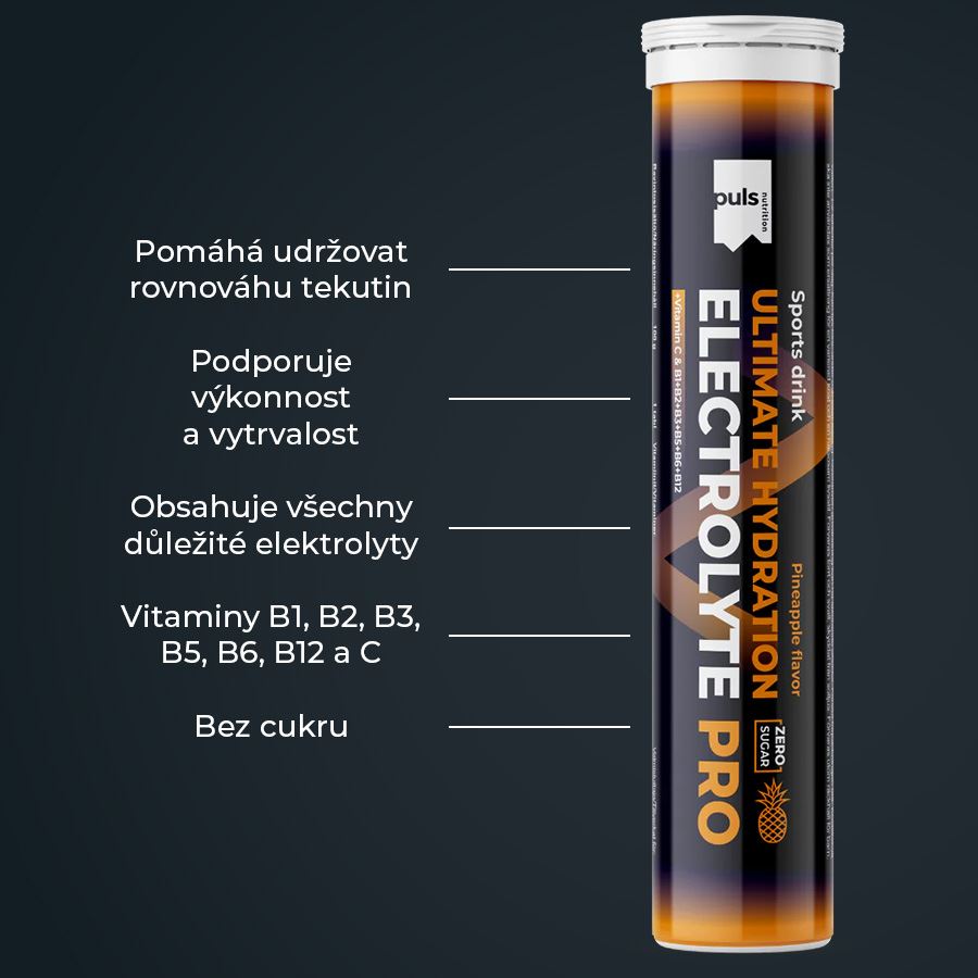 ELECTROLYTE PRODoplněk stravy, se sladidlem. SEVERSKÁ KVALITA BEZ KOMPROMISU Hydratace jednoduše. Šumivá tableta PULS Electrolyte PRO představuje efektivní způsob, jak zahnat žízeň a rychle podpořit rovnováhu tekutin v těle. Stačí rozpustit ve vodě a vychutnat si sladkou ananasovou chuť bez cukru. Hotový hydratační nápoj obsahuje všechny důležité elektrolyty a také vitaminy C, B1, B2, B3, B5, B6 a B12. Je navržen pro podporu výkonu a vytrvalosti. Obsahuje hořčík, který přispívá k normální činnosti svalů a pomáhá snižovat míru únavy a vyčerpání. Vitaminy B1, B3, B6 a B12 přispívají k normálnímu energetickému metabolismu a k normální činnosti nervové soustavy. Žádné kompromisy z hlediska jedinečné chuti a složení. Finská značka PULS NUTRITION patří ve všech ohledech k absolutní špičce sportovní a doplňkové výživy. Pomáhá udržovat rovnováhu tekutin Podporuje výkonnost a vytrvalost Obsahuje všechny důležité elektrolyty Vitamíny B1, B2, B3, B5, B6, B12, a C Bez cukru Lahodná ananasová příchuť PULS NUTRITION - FUEL FOR THE PASSIONATE ONES O značce Inspirujeme naše zákazníky, aby v každodenním životě dělali ta nejlepší rozhodnutí. PULS vznikl ve Finsku z potřeby skloubit hektický a aktivní životní styl se zdravou a výživnou stravou. V PULS věříme, že sportovní výživa a nápoje nejsou určeny jen vrcholovým sportovcům. Pokud se používají správně, mohou fyzicky i psychicky prospět každému, kdo potřebuje v běžném dni trochu povzbuzení nebo energetický přísun. Naše poslání Naším posláním je dodávat životu energii prostřednictvím sportovní výživy. Nabízíme chutné a funkční produkty navržené tak, aby podpořily a pomohly naplno rozvinout váš potenciál. Naše hodnoty Kvalita je naší hlavní prioritou. Chuť - Naše produkty musí vždy skvěle chutnat. V tomto směru neděláme žádné kompromisy. Zdraví a benefity - Všechny naše produkty jsou zdravější volbou. Ne všechny jsou však bez obsahu cukru, bezlepkové či veganské — protože nejsme striktní a jsme ochotni ke kompromisu, pokud přináší přidanou hodnotu. Dostupnost - Naším cílem je, aby byly naše produkty snadno dostupné — ať už ve vašem místním obchodě, nebo pohodlně online. Dostupná cena - Za kvalitní produkty není nutné utrácet jmění. Chceme nabízet nejlepší poměr ceny a kvality na trhu, aniž bychom dělali kompromisy v oblasti kvality či bezpečnosti. Balení: 20 tablet (82 g) Dávkování: 1 tabletu rozpusťte ve 200 ml vody. Užívejte 1-2 šumivé tablety denně. Lze užívat před, během a po cvičení. Upozornění: Skladujte v suchu, chladu, mimo dosah dětí. Nepřekračujte doporučené denní dávkování. Není náhrada stravy. Obsahuje více než 10 g polyolů/ 100 g produktu - nadměrné užívání může mít projímavé účinky. 1 tableta poskytuje: Aktivní látky: 4,1 g (1 tableta) (% RHP*) vitamín C 40 mg (50 %*) vitamín B1 0,55 mg (50 %*) vitamín B2 0,7 mg (50 %*) vitamín B3 8 mg (50 %*) vitamín B5 3 mg (50 %*) vitamín B6 0,7 mg (50 %*) vitamín B12 1,25 µg (50 %*) hořčík 100 mg (27 %*) draslík 150 mg (8 %*) vápník 120 mg (15 %*) sodík 150 mg chlorid 122 mg (15 %*) *% referenční hodnoty příjmu vitamínů a minerálních látek. Složení: regulátor kyselosti kyselina citronová, zpevňující látka sorbitol, uhličitan hořečnatý, hydrogenuhličitan sodný, uhličitan vápenatý, uhličitan draselný, chlorid sodný, chlorid draselný, přírodní aroma, kyselina L-askorbová (vitamin C), zpevňující látka polyethylenglykol, sladidlo sukralóza, koncentrát ananasové šťávy, barvivo karoteny, nikotinamid (vitamin B3), D-pantothenát vápenatý (vitamin B5), vápník (kyselina pantothenová), kyanokobalamin (vitamin B12), pyridoxin-hydrochlorid (vitamin B6), riboflavin (vitamin B2), thiamin mononitrát (vitamin B1).