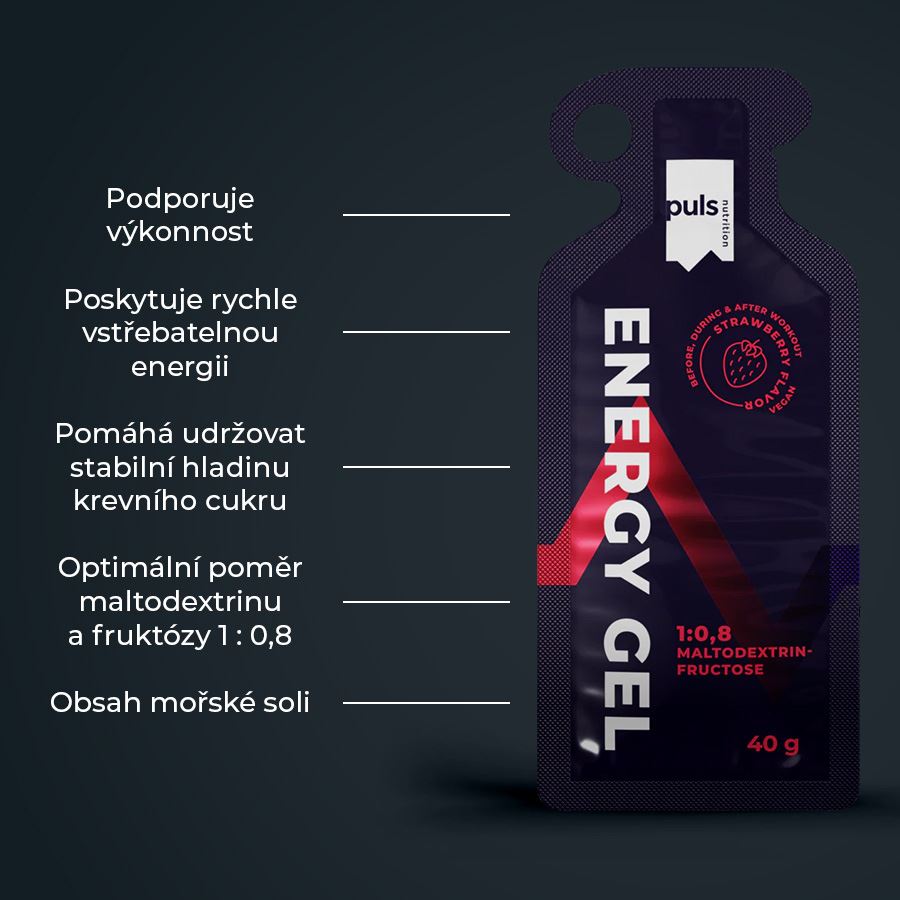 Puls Energy Gel podporuje výkon při vytrvalostních sportech s dlouhým trváním, jako je běh, cyklistika nebo triatlon. Osvěžující jahodová příchuť.