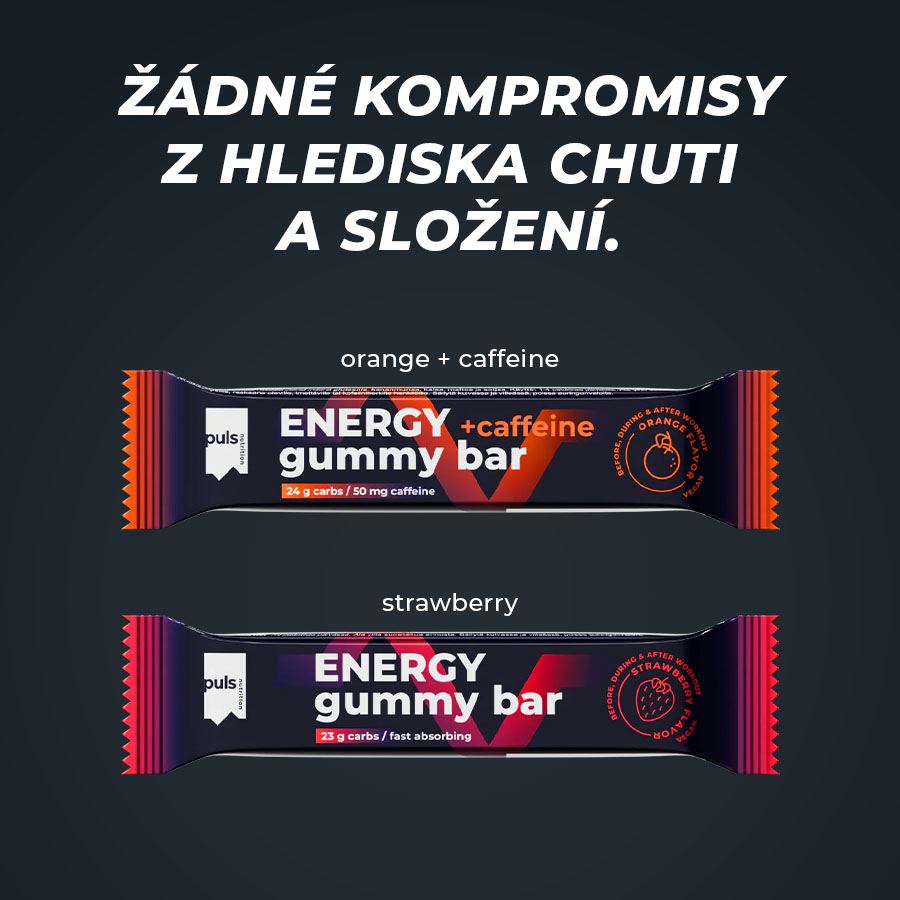 ENERGY GUMMY BAR SEVERSKÁ KVALITA BEZ KOMPROMISU Pro dlouhodobou podporu výkonu. Tyčinka PULS Energy je navržena pro podporu výkonu - jahodová želé receptura se rychle vstřebává a poskytuje okamžitý přísun energie díky 23 g rychle vstřebatelných sacharidů. Tato praktická a veganská tyčinka vám dodá energii během náročných tréninků i vytrvalostních aktivit. Měkká a snadno žvýkatelná textura přináší příjemný zážitek při konzumaci. Vyzkoušejte dokonale přenosné energetické řešení – ať už míříte do posilovny, běháte, jezdíte na kole nebo potřebujete doplnit energii během závodu. Lahodná jahodová příchuť promění doplnění energie v příjemný moment, zatímco praktický formát umožňuje mít tyčinku vždy po ruce – v tašce do fitka, kapse nebo cyklistickém dresu. Pro komplexní podporu při tréninku kombinujte s naším nápojem HDR Electrolyte Drink, který pomáhá udržet optimální hydrataci při posouvání vašich limitů. Žádné kompromisy z hlediska jedinečné chuti a složení. Finská značka PULS NUTRITION patří ve všech ohledech k absolutní špičce sportovní a doplňkové výživy. Okamžitý přísun energie Podpora vytrvalostního výkonu 23 g sacharidů v jedné želé tyčince Rychlá vstřebatelnost Měkká a šťavnatá textura Rostlinného původu Ideální zdroj energie pro sport, práci i volný čas Snadné přenášení a konzumace na cestách PULS NUTRITION - FUEL FOR THE PASSIONATE ONES O značce Inspirujeme naše zákazníky, aby v každodenním životě dělali ta nejlepší rozhodnutí. PULS vznikl ve Finsku z potřeby skloubit hektický a aktivní životní styl se zdravou a výživnou stravou. V PULS věříme, že sportovní výživa a nápoje nejsou určeny jen vrcholovým sportovcům. Pokud se používají správně, mohou fyzicky i psychicky prospět každému, kdo potřebuje v běžném dni trochu povzbuzení nebo energetický přísun. Naše poslání Naším posláním je dodávat životu energii prostřednictvím sportovní výživy. Nabízíme chutné a funkční produkty navržené tak, aby podpořily a pomohly naplno rozvinout váš potenciál. Naše hodnoty Kvalita je naší hlavní prioritou. Chuť - Naše produkty musí vždy skvěle chutnat. V tomto směru neděláme žádné kompromisy. Zdraví a benefity - Všechny naše produkty jsou zdravější volbou. Ne všechny jsou však bez obsahu cukru, bezlepkové či veganské — protože nejsme striktní a jsme ochotni ke kompromisu, pokud přináší přidanou hodnotu. Dostupnost - Naším cílem je, aby byly naše produkty snadno dostupné — ať už ve vašem místním obchodě, nebo pohodlně online. Dostupná cena - Za kvalitní produkty není nutné utrácet jmění. Chceme nabízet nejlepší poměr ceny a kvality na trhu, aniž bychom dělali kompromisy v oblasti kvality či bezpečnosti. Balení: 30 g Dávkování: Konzumujte při sportu 1-4 tyčinky denně. Upozornění: Uchovávejte v suchu a chladu, mimo dosah slunečního záření a dětí. Může obsahovat stopy lepku, vajec, ryb, mléka a sóji. Výživové údaje: na 100 g na 30 g (1 balení) Energetická hodnota 1351 kJ / 318 kcal 405 kJ / 96 kcal Tuky 0,2 g 0,1 g z toho nasycené mastné kyseliny 0,2 g 0,1 g Sacharidy 77 g 23 g z toho cukry 71 g 21 g Bílkoviny 0,1 g 0 g Sůl 0,18 g 0,05 g Složení: cukr, voda, glukózový sirup, fruktózový sirup, pektin [pektin, regulátory kyselosti (vinan sodno-draselný a polyfosfát), maltodextrin], aroma, regulátor kyselosti kyselina citronová, lešticí olej [kokosový olej, lešticí látka (karnaubský vosk)], mrkvový a rybízový koncentrát.