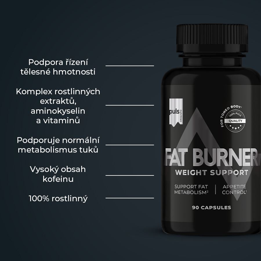 FAT BURNERDoplněk stravy. S vysokým obsahem kofeinu (200 mg/ 2 kapsle). Nevhodné pro děti, těhotné a kojící ženy. SEVERSKÁ KVALITA BEZ KOMPROMISU Podpora pro weight management. PULS Fat Burner přináší sílu do oblasti řízení tělesné hmotnosti. Obsahuje rostlinné extrakty a prášky - prášek ze zeleného čaje, prášek ze zelených kávových zrn, prášek z yerba maté, extrakt z kořene rozchodnice růžové (Rhodiola rosea), extrakt z garcinie kambodžské, extrakt z kajenského pepře, extrakt z guarany (Paullinia cupana), bezvodý kofein, aminokyseliny - L-tyrosin, HMB, a antioxidanty a vitamíny - kyselinu alfu-lipoovou, DL-cholin bitartrát, kyselina pantothenovou, kyselina listovou, D-biotin a methylkobalamin. Pomáhá dosáhnout a udržet cílovou postavu a hmotnost. Obsahuje extrakt z Garcinia Cambogia, který podporuje kontrolu hmotnosti, snižuje chuť k jídlu a ukládání tuků. Yerba maté podporuje metabolismus tuků, napomáhá jejich odbourávání a pomáhá udržovat žádoucí hmotnost. Cholin obsažený v produktu přispívá k normálnímu metabolismu tuků. Pro dosažení nejlepších výsledků doporučujeme kombinovat kapsle Fat Burner s pravidelným pohybem a pestrou stravou. Kofein v produktu pomáhá zvyšovat vytrvalostní výkon a kapacitu, takže můžete trénovat intenzivněji a déle. Zvýšený energetický výdej v kombinaci se složkami podporujícími spalování tuků a metabolismus maximalizuje účinek. Žádné kompromisy z hlediska jedinečné chuti a složení. Finská značka PULS NUTRITION patří ve všech ohledech k absolutní špičce sportovní a doplňkové výživy. Podpora řízení tělesné hmotnosti Komplex rostlinných extraktů, aminokyselin a vitamínů Podporuje normální metabolismus tuků Vysoký obsah kofeinu 100% rostlinný PULS NUTRITION - FUEL FOR THE PASSIONATE ONES O značce Inspirujeme naše zákazníky, aby v každodenním životě dělali ta nejlepší rozhodnutí. PULS vznikl ve Finsku z potřeby skloubit hektický a aktivní životní styl se zdravou a výživnou stravou. V PULS věříme, že sportovní výživa a nápoje nejsou určeny jen vrcholovým sportovcům. Pokud se používají správně, mohou fyzicky i psychicky prospět každému, kdo potřebuje v běžném dni trochu povzbuzení nebo energetický přísun. Naše poslání Naším posláním je dodávat životu energii prostřednictvím sportovní výživy. Nabízíme chutné a funkční produkty navržené tak, aby podpořily a pomohly naplno rozvinout váš potenciál. Naše hodnoty Kvalita je naší hlavní prioritou. Chuť - Naše produkty musí vždy skvěle chutnat. V tomto směru neděláme žádné kompromisy. Zdraví a benefity - Všechny naše produkty jsou zdravější volbou. Ne všechny jsou však bez obsahu cukru, bezlepkové či veganské — protože nejsme striktní a jsme ochotni ke kompromisu, pokud přináší přidanou hodnotu. Dostupnost - Naším cílem je, aby byly naše produkty snadno dostupné — ať už ve vašem místním obchodě, nebo pohodlně online. Dostupná cena - Za kvalitní produkty není nutné utrácet jmění. Chceme nabízet nejlepší poměr ceny a kvality na trhu, aniž bychom dělali kompromisy v oblasti kvality či bezpečnosti. Balení: 90 kapslí (85 g) Dávkování: Užívejte 2 kapsle denně. Dávkování upraveno dle legislativy ČR. Upozornění: Nepřekračujte doporučenou denní dávku. Nenahrazuje pestrou stravu. Skladujte v chladu a suchu, mimo dosah dětí a slunečního záření. Aktivní látky: ve 2 kapslích (% RHP*) Extrakt z guarany 200 mg Prášek ze zeleného čaje 200 mg Prášek ze zelených kávových zrn 200 mg HMB 200 mg L-tyrosin 66 mg Extrakt z kořene rhodioly 66 mg Kyselina alfa-lipoová (ALA) 66 mg Extrakt z kajenského pepře 66 mg Yerba maté prášek 66 mg Extrakt z garcinie 66 mg Cholin 27 mg Vitamín B5 (kyselina pantothenová) 7,4 mg (123 %*) Kyselina listová 267 µg (133 %*) Biotin 60 µg (120 %*) Vitamín B12 16 µg (640 %*) *Referenční hodnota příjmu vitamínů a minerálních látek. Složení: maltodextrin (z kukuřice), obal kapsle hydroxypropylmethylcelulóza, prášek ze zeleného čaje (Camellia sinensis), extrakt z guarany (Paullinia Cupana), prášek ze zelených kávových zrn (Coffea arabica), HMB (hydroxymetylbutyrát vápenatý), L-tyrosin, Yerba maté (Ilex paraguariensis), extrakt z kořene rhodioly (rozchodnice) (Rhodiola rosea), extrakt z garcinie (Garcinia cambogia), bezvodý kofein, kyselina alfa-lipoová (ALA), extrakt z kajenského pepře (Capsicum annuum), DL-cholin bitartrát, kyselina pantothenová (D-pantothenát vápenatý), emulgátor (stearan hořečnatý), protiskékavá látka oxid křemičitý, kyselina listová (kyselina pteroylmonoglutamová), biotin (D-biotin), vitamín B12 (methylkobalamin).