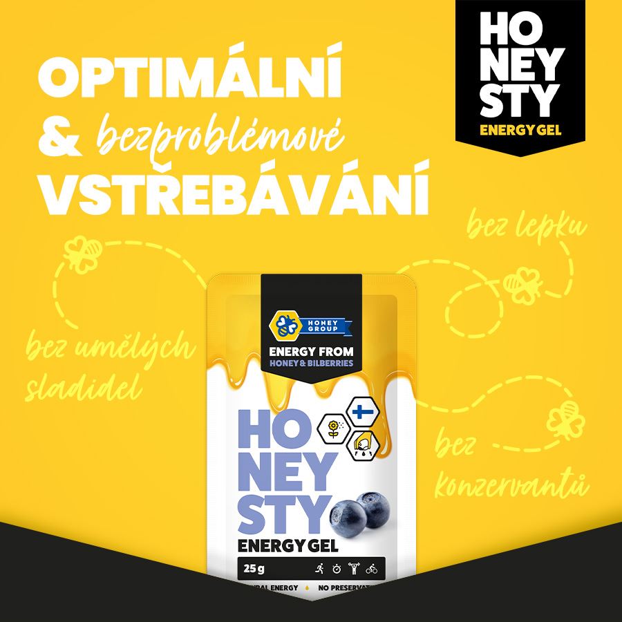 HONEYSTY = SÍLA, ČISTOTA A JEMNOST FINSKÉHO MEDU HONEYSTY = UNIKÁTNÍ ENERGETICKÝ GEL ŠETRNÝ K ŽALUDKU HONEYSTY = 100% NATURÁLNÍ VOLBA O finském medu Energetické gely Honeysty jsou součástí portfolia produktů finské společnosti Honey Group, která více než 50 let přináší spotřebitelům nejkvalitnější finský med. Finsko je nejsevernější místo na zemi, kde se med sklízí, a je také jedno z nejčistších. Značka Honey Group se pyšní certifikátem Produced in Finland a také certifikátem výrobního procesu ISO 22000. Med se skládá z více než 200 složek, z nichž většinu tvoří fruktóza a glukóza. Dále obsahuje vodu, sacharózu, maltózu, enzymy, organické sloučeniny a minerály. Cukry tvoří přes 70 % medu, zatímco enzymy a minerální látky tvoří například kolem 6 %. Včely sbírají nektar z divokých a kulturních rostlin, takže přesný poměr přísad se liší v závislosti na typu medu. Z tohoto důvodu se také velmi liší chuť, barva a konzistence různých odrůd medu! Glukóza, kterou med obsahuje, je pro lidi životně důležitý cukr. Vstřebává se do našeho krevního oběhu a dodává nám energii. Glukóza se do našeho těla vstřebává rychle a účinně zvyšuje hladinu cukru v krvi, zatímco fruktóza se vstřebává pomaleji a udržuje hladinu cukru i po delší dobu.. Podloženo výzkumy Složení gelů Honeysty je podložené výzkumem. Studie zkoumala jejich vliv na výkonnost neuromuskulárního systému. Byly měřeny hladiny dýchacích plynů, puls, hladina glukózy a laktátu v plazmě během rozdílných tréninkových dávek. Byla také měřena výkonnost při vytrvalostních disciplínách. Testovanými subjekty ve studiu bylo devět mužů, kteří měli zkušenosti s kolektivními sporty. Běželi na aerobním prahu po dobu 45 minut, poté byla rychlost třikrát zvýšena v pětiminutových intervalech a třetí úroveň byla udržována až do vyčerpání (80 %, 85 % a 90 % VO2max). Subjekty provedly stejný výkon třikrát s použitím jiného gelu. Gely použité při studii - Honeysty přírodní gel na medové bázi (sacharidy 44 g/100 g gelu, fruktóza a glukóza), komerční sportovní nápoj používaný jako kontrolní gel (sacharidy 55 g/100 g gelu, maltodextrin a fruktóza), placebo gel (sacharidy 0 g/100 g gelu). Podle průzkumu, který testované osoby po svém výkonu vyplnily, měl energetický gel na medové bázi nejpříjemnější chuť. Konzumace energetických gelů, které obsahovaly sacharidy (gel na bázi medu a kontrolní gel), udržovala hladiny glukózy v krvi subjektů na vyšší úrovni během stálého stresu a při zvýšení rychlosti, stejně jako po zotavení. Konzumace energetických gelů obsahujících sacharidy (gel na bázi medu a kontrolní gel), udržovala hladiny glukózy na vyšší úrovni během stálého zatížení a při zvýšení rychlosti stejně jako po zotavení. Podle průzkumu, který účastníci po svém výkonu vyplnili, měl energetický gel na medové bázi nejpříjemnější chuť. Podle odpovědí účastníků měl gel na bázi medu nejlepší účinky a byl nejpříjemnější jak při výkonu, tak po něm.