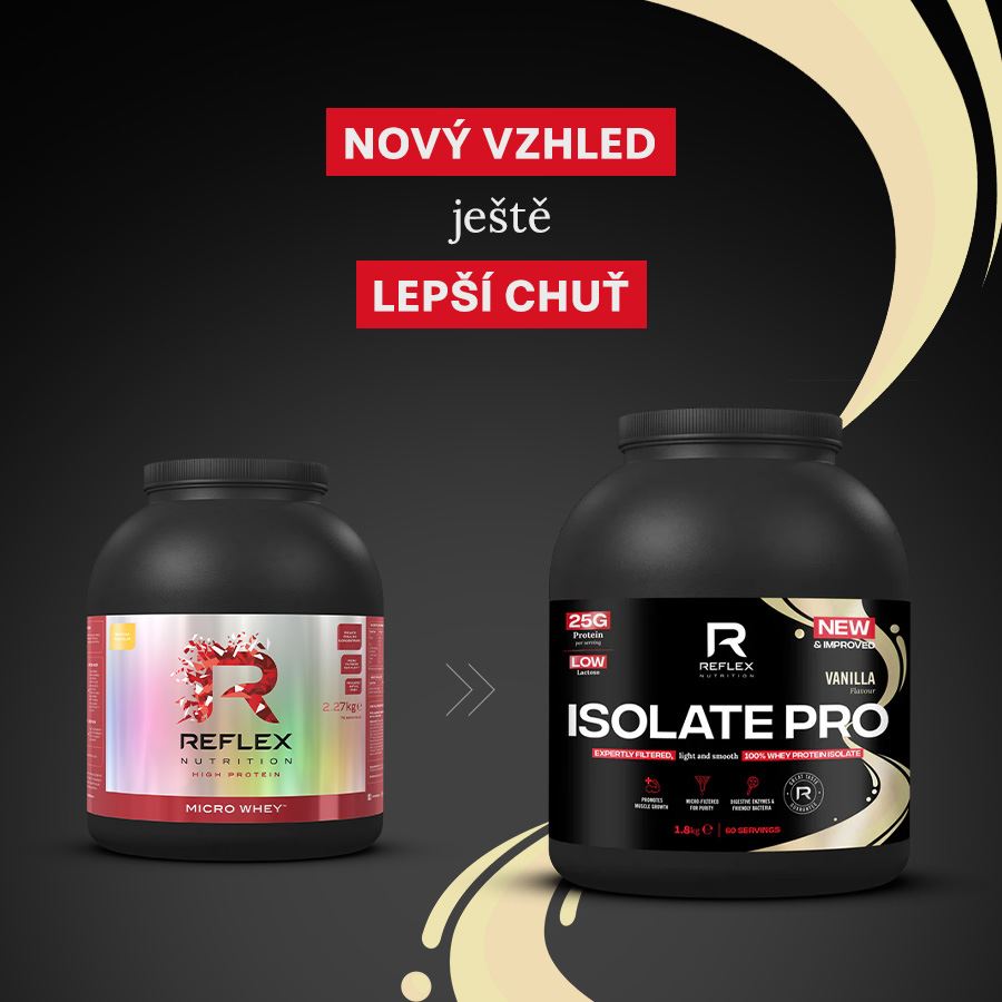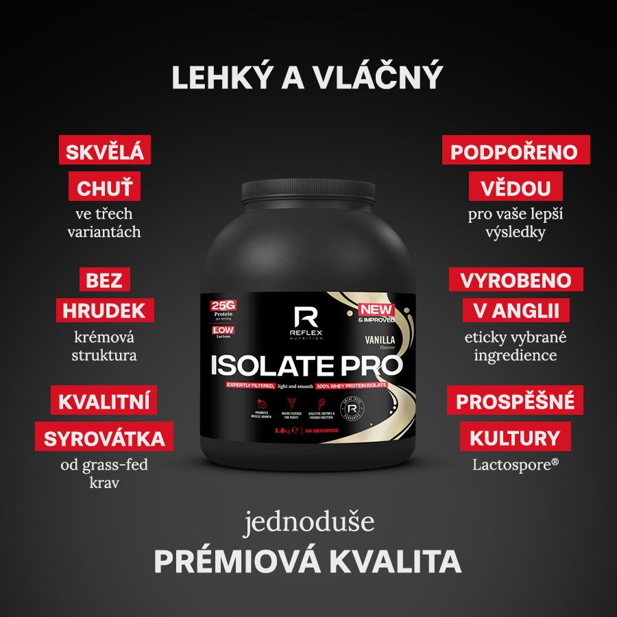 NEW ISOLATE PRODoplněk stravy se sladidly.Syrovátkový proteinový grass-fed izolát s prospěšnými probiotickými kulturami a přidanými trávícími enzymy. Isolate PRO je pečlivě připravený prémiový syrovátkový izolát s 83% obsahem bílkoviny (25 g proteinu na 30 g dávku). Je vysoce filtrovaný, takže dostáváte nejvyšší čistotu proteinu. To znamená velmi nízký obsah mléčného cukru, tuku a sacharidů. I díky tomu jde o velmi rychle vstřebatelný protein. To vše bez obsahu hormonů, s nízkým obsahem cukru, bez sójového proteinu a bez umělých barviv.Klíčové benefity 100% syrovátkový grass-fed izolát 83 % bílkovin s vysokým obsahem BCAA a esenciálních aminokyselin Vysoká filtrace, velmi nízký obsah mléčného cukru, tuku a sacharidů Velmi rychlá vstřebatelnost Žádný cukr navíc, žádná umělá barviva, nebo sójový protein Přidané probiotické kultury Lactospore® a trávící enzymy Digezyme®Pro koho je Isolate PRO určený? Pro všechny hledající rychle absorbovatelný protein, který je ultra filtrovaný Pro všechny hledající syrovátkový protein s velmi nízkým obsahem laktózy Pro všechny hledající produkt nejvyšší čistoty s nejvyšším možným % obsahem proteinuULTRA FILTROVANÝ, RYCHLE VSTŘEBATELNÝ PROTEINIsolate PRO není jen další syrovátkový izolát, který můžete dostat od jakékoli jiné značky. Je vyrobený z vysoce kvalitního zdroje, syrovátkového izolátu, který prochází dodatečnými procesy pro odstranění co nejvyššího množství tuku a sacharidů. Výsledkem je produkt, který je přibližně z 83 % čistý protein. Pokud tak hledáte cestu, pro co nejvyšší příjem proteinu bez tuku a sacharidů, je Isolate PRO ideální volba. Isolate PRO je velmi rychle absorbován v těle, je tak optimální pro regeneraci po tréninku, kdy tělo potřebuje rychle zdroj bílkoviny.Grass fed certifikace100 % proteinu použítého v Isolate PRO je grass-fed kvality. To znamená, že zdroj proteinu má certifikaci organizace Origin Green Ireland dohlížející nad standardy grass-fed, udržitelným chovem a zemědělstvím. Tato certifikace garantuje, že krávy jsou po většinu roku na pastvě, kde se krmí čerstvou travou. Ta je pro ně přirozeným zdrojem živin (na rozdíl od využití procesovaných krmných směsí a kukuřičné siláže ve velkochovech). To se znatelným způsobem odráží ve kvalitě výsledných produktů a v jejich chuti. Grass-fed mléčné produkty mají vyšší obsah omega-3, vyšší obsah CLA, vyšší obsah prekurzorů vitamínu A a E, vyšší obsah glutathionu a dalších složek. Grass-fed protein lze také poznat díky znatelně čistší chuti. Samozřejmostí je nulový obsah GMO, hormonů nebo reziduí antibiotik. HLAVNÍ SLOŽKA - GRASS FED ULTRAFILTROVANÝ SYROVÁTKOVÝ IZOLÁT 25 g PROTEINU NA 30 g DÁVKU (70 g PROTEINU NA 100 g) PROTEIN Z ETICKÝCH EVROPSKÝCH CHOV KRMENÝCH TRAVOU (GRASS-FED) PŘIDANÉ PROSPĚŠNÉ KULTURY LACTOSPORE® NOVÝ PRODUKT SE ŠPIČKOVÝMI PARAMETRY SNADNE ROZMÍCHÁNÍ, ŽÁDNÉ HRUDKY SROVNÁNÍ NOVÝCH PROTEINŮ ZNAČKY REFLEX NUTRITION 100% WHEY INSTANT WHEYTM PRO ISOLATE PRO Charakteristika 21 g čistého proteinu v dávce - z grass-fed syrovátkové bílkoviny. S přidanými probiotickými kulturami. Krémová textura podobná mléčnému šejku, bohatá chuť. 24 g čistého proteinu v dávce - z grass-fed syrovátkové bílkoviny. S přidanými probiotickými kulturami a trávícími enzymy. Lahodná a čistá chuť. 25 g čistého proteinu v dávce - z grass-fed syrovátkové bílkoviny. S přidanými probiotickými kulturami a trávícími enzymy. Lehký a jemný protein. Zdroj bílkoviny Grass-fed syrovátkový koncentrát (WPC) Grass-fed syrovátkový izolát (WPI), grass-fed syrovátkový koncentrát (WPC), grass-fed mléčný koncentrát (MPC) Grass-fed syrovátkový izolát (WPI) Množství proteinu na 100 g / 30 g 70 g / 21 g 80 g / 24 g 83 g / 25 g Výživové údaje Dávka - 30 g Kalorie - 112 kcal Tuk - 1,6 g Sacharidy 3,3 g Bílkoviny - 21 g Cukr 1,8 g Dávka - 30 g Kalorie - 103 kcal Tuk - 0,5 g Sacharidy 0,9 g Bílkoviny - 24 g Cukr 0,5 g Dávka - 30 g Kalorie - 103 kcal Tuk - <0,5 g Sacharidy 0,9 g Bílkoviny - 25 g Cukr 0,5 g Značka Reflex Nutrition Profesionální sportovní výživa Značka Reflex patří v oblasti sportovní výživy mezi světové lídry. Díky inovacím jako je nativní technologie zpracování proteinu, chelátově vázané minerály a další, špičkovým formulím, používání výhradně prémiových surovin a díky trvalé garanci kvality u všech produktů. Doplňky stravy značky Reflex se neopírají o marketingová tvrzení, ale o bezkonkureční složení prověřené profesionálními sportovci i širokou fitness komunitou. Vyrobeno v UK Všechny doplňky značky Reflex Nutrition jsou vyráběny na vlastních linkách Reflexu v Brightonu ve Spojeném království. Výrobní zařízení Reflex Nutrition v Brightonu představuje špičku ve svém oboru a zároveň dává Reflexu plnou kontrolu nad procesem výroby a nad udržením maximálního standardu. Vysoce kvalitní minerály Minerály obsažené v doplňcích jsou v organických přírodních formách, konkrétně s chelátovými vazbami. Na rozdíl od levných anorganických forem jsou přirozené pro tělo a proto lépe vstřebatelné. Množství minerálu absorbovaného do těla a následná bioaktivita je u organických forem minerálů výraznější než u anorganických forem. Grass-fed proteiny Proč užívat levný protein od skotu z velkochovů, ve kterém jsou rezidua antibiotik, rBGH/ rBST hormonů a pesticidů z nekvalitního GMO krmiva, když lze použít superprémiový protein od chovů krmených travou? Žádná kukuřice, jen tráva a pobyt na pastvě tak dlouho, jak jen to je možné. Na výsledné chuti a především kvalitě je to obrovsky znát. Prémiové suroviny Značka