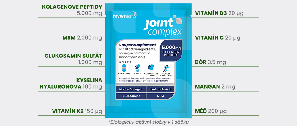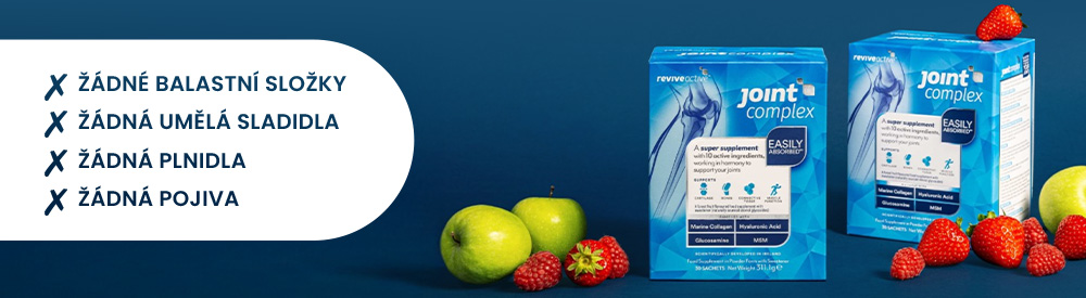 JOINT COMPLEX Doplněk stravy, se sladidlem steviol-glykosid. Superdoplněk stravy pro klouby, vazy a chrupavky s obsahem deseti přesně cílených složek pečlivě vybraných od prověřených a celosvětově uznávaných producentů. Žádné balastní složky, umělá sladidla a pojiva. Jednorázové sáčky nabízí snadnou manipulaci a rychlou přípravu chutného instantního nápoje ve formě lahodného džusu. Joint Complex byl vyvinut špičkovými odborníky a farmaceuty a to s cíleným požadavkem na nejvyšší možnou sílu a využitelnost jednotlivých složek, které vzájemně umocňují svůj účinek KOMPLEXNÍ OCHRANA pro klouby a pohybový aparát Pohybový aparát Klouby Chrupavky Vazy a šlachy Svaly Kyselina hyaluronová bioaktivní molekula fungující jako obal buněk chrupavky Mořský kolagen (kolagenní peptidy) hlavní stavební látka pro pohybový aparát MSM přírodní sloučenina s obsahem síry, která je stavební látkou kolagenu Glukosamin sulfát 2KCL přírodní látka přítomná v chrupavkách Bioaktivní vitamín D3 400 % doporučené denní dávky Bioaktivní vitamín K2 (MK-7) 200 % doporučené denní dávky Bioaktivní vitamín C 250 % doporučené denní dávky měď, bór a mangan Důležité minerální prvky ALL-IN-ONE Joint Complex je navržený pro dospělé 18+, užívat jej mohou všechny věkové skupiny. Joint Complex není další obyčejný doplněk, jde o superdoplněk s množstvím účinných látek, které je pro podobné produkty zcela netypické. Joint Complex se od jiných produktů odlišuje velmi silnou kombinací všech potřebných účinných látek jako je mořský kolagen, MSM, glukosamin a kyselina hyaluronová s vitamíny a minerály. Prášek je snadno rozmíchatelný ve vodě nebo libovolném nápoji. Jeden sáček dodá potřebné kloubní nutrienty pro celý den. Doplněk je kompletně bez lepku a je slazený steviol-glykosidy. JAK UŽÍVAT JOINT COMPLEX ① Otevřete sáček a nasypejte do sklenice ② Přidejte 250 - 300 ml vody ③ Zamíchejte a vypíjte Můžete přidat také do ranního smoothie nebo džusu. Užívejte ráno na prázdný žaludek nebo před výkonem. Povolená zdravotní tvrzení podle Nařízení Evropské komise č. 432/2012 Měď přispívá k udržení normálního stavu pojivových tkání / Měď přispívá k ochraně buněk před oxidativním stresem / Mangan přispívá k udržení normálního stavu kostí / Mangan přispívá k normální tvorbě pojivových tkání / Mangan přispívá k ochraně buněk před oxidativním stresem / Vitamin K přispívá k udržení normálního stavu kostí / Vitamin C přispívá k normální tvorbě kolagenu pro normální funkci kostí / Vitamin C přispívá k normální tvorbě kolagenu pro normální funkci chrupavek / Vitamin C přispívá k ochraně buněk před oxidativním stresem CERTIFIKÁTY A UDRŽITELNOST Vlastní výroba v našich dvou nejmodernějších výrobnách v Irsku. Sáčky a stickpacky jsou hermeticky uzavřeny, aby poskytovaly bariéru proti světlu, vlhkosti a jiné vnější kontaminaci a udržovaly integritu a účinnost aktivních složek. Výrobní závody Revive Active jsou certifikovány podle standardu BRCGS Global Food Safety V9, Grade AA, s počáteční certifikací získanou v květnu 2023. BRCGS Global Food Safety Standard poskytuje rámec pro řízení bezpečnosti produktů, integritu, zákonnost, kvalitu a provozní kontroly pro tato kritéria v potravinářském průmyslu. Revive Active se snaží fungovat ekologicky, s vědomím splnění standardů ESG s prvotní identifikací základní úrovně uhlíku, identifikovanými emisemi uhlíku v rozsahu 1 a rozsahu 2 a hodnocení dopadu BCorp B v procesu. Cílem je dosáhnout členství v BCorp. O ZNAČCE REVIVE ACTIVE Revive Active je v současné době nejsilnější značkou vitamínových a potravinových doplňků v Irsku. Vznikla v roce 2011, její zakladatel a v současné době výkonný ředitel Daithi O'Connor byl motivován cílem poskytnout lidem spektrum vědecky podložených suplementů, které skutečně fungují. Vybudoval kolem sebe tým expertů z pole vědy, výživy, vývoje a výzkumu. Revive Active se postupně rozrostla a nyní exportuje do 48 zemí světa. Výzkumný tým Revive Active spolupracuje s lídry v oblasti zdraví a výživy jako je například Kerry Group, pro výsledky v podobě inovativních produktů s opravdovými účinky. Jsou připravovány a baleny ve výrobním zařízení v Mullingaru, kraji Westmeath v Irsku. Kontrola našeho dodavatelského řetězce znamená, že vždy dodržujeme přední průmyslové standardy. Naše doplňky jsou navrženy tak, aby kombinovaly aktivní složky, které mají největší účinek pro každou věkovou skupinu v její konkrétní životní fázi. Prostřednictvím doplňkové výživy tak můžete s jistotou čelit výzvám, ať už ve škole, v práci nebo při hře. Upřímně rozumíme výzvám, kterým naši zákazníci čelí, staráme se o ně a pomáháme jim změnit to, jak se cítí a jak se zapojují do světa. Etika - důvěra a udržitelnost vedou naši neúnavnou snahu o co nejlepší produkty pro naše zákazníky.. Balení: 7 sáčků (72,6 g) Dávkování: rozpusťte obsah sáčku v 250-300 ml vody a ihned vypijte (pokud je voda příliš vychlazená, může se prášek rozpouštět déle). Užívejte kdykoli během dne, nejlépe hodinu po jídle. Upozornění: Není náhrada pestré stravy. Nepřekračujte doporučenou denní dávku. Skladujte v suchu a chladu, mimo dosah dětí. Může obsahovat stopy mléka a sóji. Pokud užíváte pravidelně léky nebo jste těhotná či kojící žena, konzultujte užívání s lékařem. Není určeno pro osoby do 18 let. Aktivní látky: v jednom sáčku (10,3 g) (% RHP*) Kolagenové peptidy 5000 mg MSM (methylsulfonylmethan) 2000 mg Glukosamin sulfát 2KCl 1000 mg Vitamín C (kyselina L-askorbová) 200 mg (250 