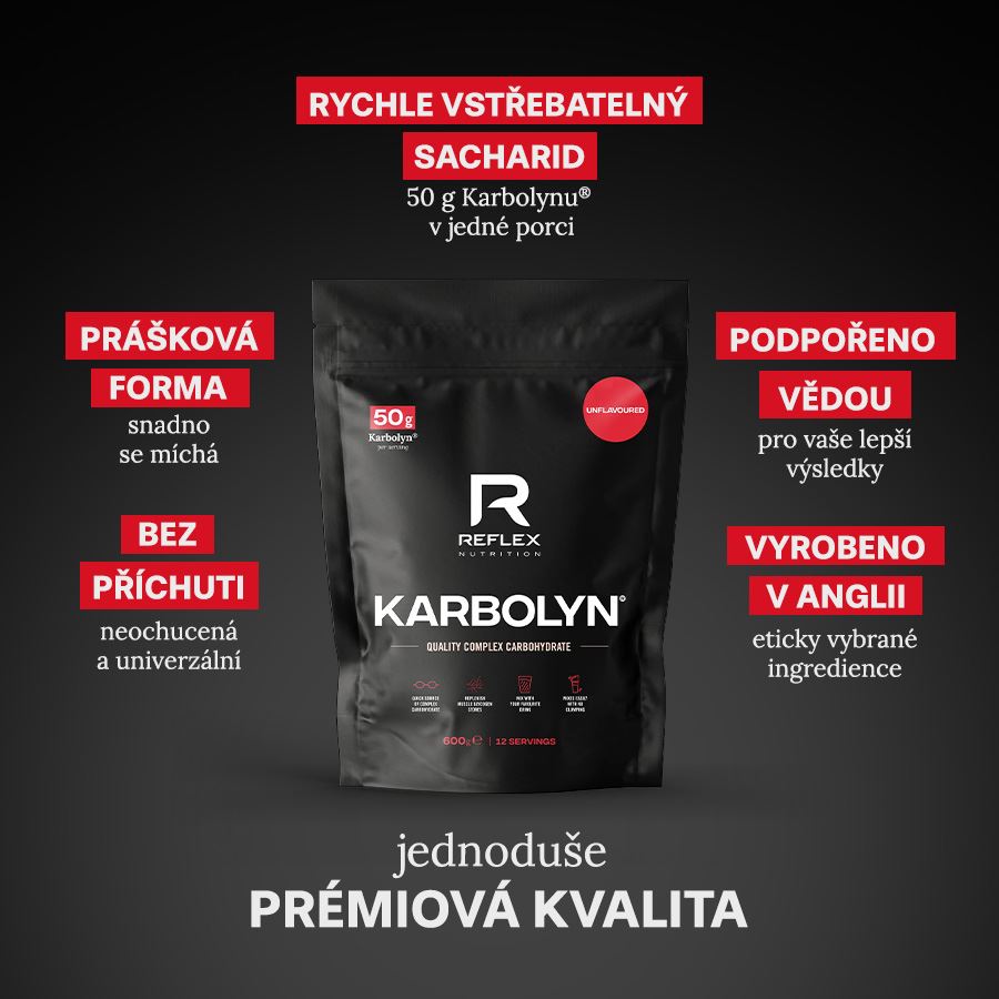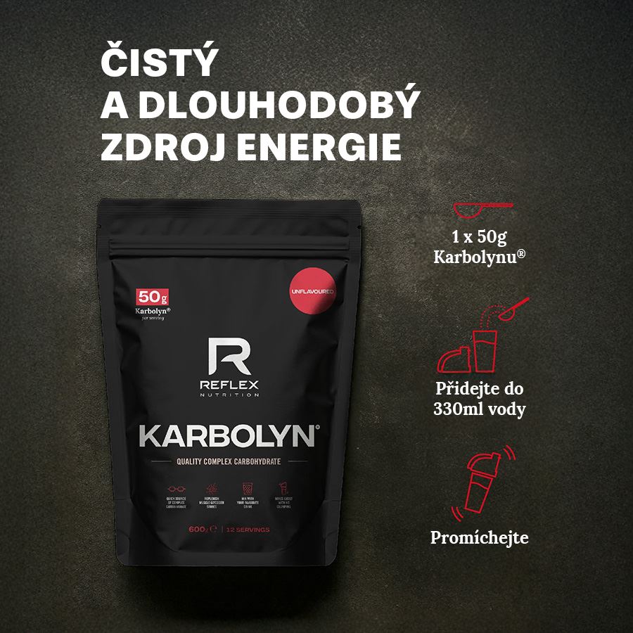 KARBOLYN®Doplněk stravy - neochucený zdroj sacharidů (Karbolyn®)Karbolyn® je patentovaný komplexní sacharid navržený pro rychlost a efektivitu (0% cukru, 0% tuku). Je vyvinut tak, aby se rychle vstřebával a poskytoval stabilní energii bez výkyvů a následných propadů, které jsou typické pro jednoduché cukry.Každá dávka obsahuje 50 g rychle působících komplexních sacharidů, které poskytují čistý a spolehlivý zdroj energie. Díky neochucené formě a snadné rozpustnosti je ideální pro doplnění energie svalů před, během i po intenzivním tréninku – bez propadů energie typických pro jednoduché cukry.Karbolyn® je čistý a dlouhodobý zdroj energie, který pomáhá doplňovat svalový glykogen a podporovat výkon před, během i po intenzivním tréninku. Díky neochucené formě a snadné rozpustnosti jej lze jednoduše zařadit do vašeho režimu – ať už potřebujete dodat energii, udržet její stabilní hladinu nebo podpořit regeneraci před dalším tréninkem.Hlavní benefity:- Rychle vstřebatelný sacharid – 50 g Karbolynu® v jedné porci- Působí dlouhodobě, dodává energii efektivně- Podporuje energii před, během i po tréninku- Pomáhá efektivně doplňovat svalový glykogen- 0 g cukru, 0 g tuku – čistý a stabilní zdroj energie- Snadno se míchá – neochucený a univerzální- Vhodné pro vegany Kdy jej využijete: - Pokud tvrdě trénujete a potřebujete energii, která udrží krok s vaším výkonem.- Potřebujete rychlý a stabilní zdroj energie, který nezpůsobuje prudké výkyvy ani následné propady.- Chcete efektivně doplňovat svalovou energii před, během nebo po náročném tréninku.- Hledáte čistý, neochucený sacharid, který se snadno míchá s vaším běžným proteinovým nebo tréninkovým nápojem. O Karbolynu®Karbolyn® je precizní palivo pro maximální výkon navržené pro rychlé vstřebávání a postupné uvolňování energie. Pomáhá rychle obnovovat zásoby glykogenu a udržovat svaly v činnosti během všech fází tréninku. Karbolyn® je patentovaný komplexní sacharid (polysacharid) navržený tak, aby se vstřebával velmi rychle, ale přitom dodával energii postupně. Je vyrobený z kombinace brambor, rýže a kukuřice a technologicky upravený tak, aby měl optimální molekulární velikost pro rychlé vstřebávání. Jednoduše řečeno se chová jako jednoduchý cukr, ale poskytuje stabilní energii jako komplexní sacharid.Při intenzivním tréninku svaly výrazně využívají uložený glykogen – hlavní zdroj energie pro sílu a vytrvalost. Jakmile se tyto zásoby snižují, výkon klesá a přichází únava. Karbolyn® je patentovaný sacharid navržený pro rychlé vstřebávání a efektivní doplnění glykogenu, což pomáhá svalům doplnit energii před tréninkem, udržet výkon během něj a podpořit regeneraci po jeho skončení.Jeho jedinečná struktura umožňuje rychlý průchod žaludkem do krevního oběhu, kde poskytuje stabilní zdroj energie bez prudkých výkyvů, které způsobují jednoduché cukry. V krátkodobém horizontu to znamená silnější tréninky, lepší vytrvalost a rychlejší regeneraci. Při pravidelném doplňování energie a regeneraci se tento cyklus vyčerpání a obnovy postupně promítá do dlouhodobé odolnosti organismu – svaly zůstávají lépe zásobené energií, hladina energie stabilní a výkon konzistentní den za dnem. Značka Reflex NutritionProfesionální sportovní výživaZnačka Reflex patří v oblasti sportovní výživy mezi světové lídry. Díky inovacím jako je nativní technologie zpracování proteinu, chelátově vázané minerály a další, špičkovým formulím, používání výhradně prémiových surovin a díky trvalé garanci kvality u všech produktů. Doplňky stravy značky Reflex se neopírají o marketingová tvrzení, ale o bezkonkureční složení prověřené profesionálními sportovci i širokou fitness komunitou.Vyrobeno v UKVšechny doplňky značky Reflex Nutrition jsou vyráběny na vlastních linkách Reflexu v Brightonu ve Spojeném království. Výrobní zařízení Reflex Nutrition v Brightonu představuje špičku ve svém oboru a zároveň dává Reflexu plnou kontrolu nad procesem výroby a nad udržením maximálního standardu.Vysoce kvalitní minerályMinerály obsažené v doplňcích jsou v organických přírodních formách, konkrétně s chelátovými vazbami. Na rozdíl od levných anorganických forem jsou přirozené pro tělo a proto lépe vstřebatelné. Množství minerálu absorbovaného do těla a následná bioaktivita je u organických forem minerálů výraznější než u anorganických forem.Grass-fed proteinyProč užívat levný protein od skotu z velkochovů, ve kterém jsou rezidua antibiotik, rBGH/ rBST hormonů a pesticidů z nekvalitního GMO krmiva, když lze použít superprémiový protein od chovů krmených travou? Žádná kukuřice, jen tráva a pobyt na pastvě tak dlouho, jak jen to je možné. Na výsledné chuti a především kvalitě je to obrovsky znát.Prémiové surovinyZnačka Reflex Nutrition nepoužívá sójový protein nebo jiné levné suroviny. Veškeré použité složky, proteiny, minerály, vitamíny, enzymy, probiotika a rostlinné extrakty mají nejvyšší možný rating.Zelená energieReflex při výrobě používá energii ze solárních panelů. Pokud nedostačuje, vypomáhá společnost Ecotricity vyrábějící pomocí větrných a slunečních elektráren nejčistší elektřinu ve Velké Británii. V budovách Reflex se nepoužívá žádný plyn, naopak je široce využité sluneční světlo, žárovky mají časovače a jsou nastavené na úporný provoz. Reflex se rovněž snaží šetřit papírem a papírovým materiálem - použité kartony jsou na vlastní drtičce zpracované na výplň do zásilek. Na svět také přišel první doplněk Reflex s kompostovatelným obale