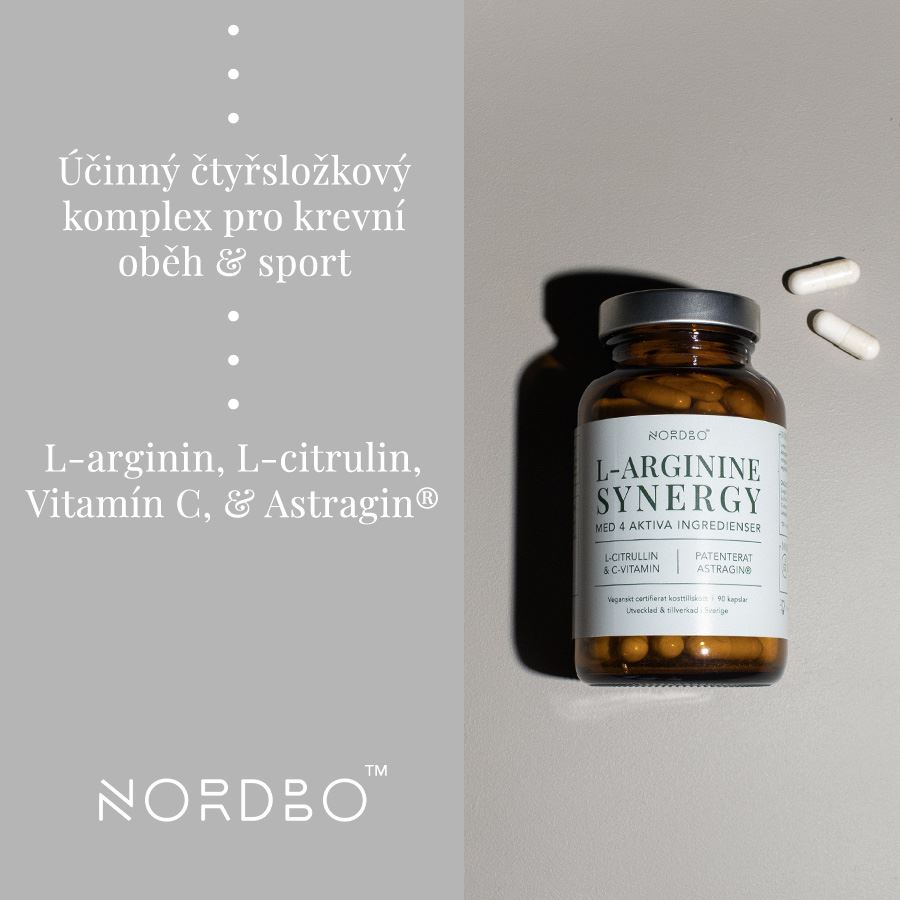 L-ARGININE SYNERGY Doplněk stravy. - ÚČINNÝ ČTYŘSLOŽKOVÝ KOMPLEX PRO KREVNÍ OBĚH A SPORT- L-arginin - 500 mg v 1 kapsli- L-citrulin - 200 mg v 1 kapsli- Vitamín C (askorbát vápenatý) - 80 mg v 1 kapsli- Astragin® - 17,5 mg v 1 kapsli- Certifikát I'm Vegan organizace Djurens Rätt (Animal Rights)- Produkt neobsahuje živočišné složky, pojiva a nežádoucí balastní složky- NORDBO = kvalita a klinicky prověřené zdroje + udržitelnost a etická odpovědnost L-Arginine Synergy je synergický komplex, který kombinuje aminokyseliny L-arginin a L-citrulin s vitaminem C (ve formě askorbátu vápenatého) a AstraGin®. L-arginin je semiesenciální aminokyselina, L-citrulin se v těle přeměňuje na arginin a je považován za látku, která udržuje hladinu argininu delší a stabilnější. Kombinace L-argininu a L-citrulinu je obzvláště prospěšná pro vytrvalost a optimální cirkulaci krve (vytrvalost + dlouhověkost) – ale také v dalších situacích, kde jsou tyto vlastnosti žádoucí. Vitamin C ve formě askorbátu vápenatého je neacidická forma šetrná k žaludku, vitamín C přispívá k ochraně buněk před oxidačním stresem, k udržení normální funkce imunitního systému a ke snížení únavy a vyčerpání. AstraGin® je patentovaný rostlinný extrakt z astragalu a ženšenu, u něhož bylo ve studiích prokázáno, že podporuje vstřebávání aminokyselin.L-Arginine Synergy je určený pro:- Jedince, kteří chtějí zlepšit krevní oběh- Sportovce usilující o zvýšení výkonnosti a vytrvalosti- Jedince, kteří chtějí optimalizovat produkci oxidu dusnatého- Jedince, kteří chtějí podpořit srdce a kardiovaskulární systém- Jedince s aktivním životním stylem, kteří chtějí zlepšit svůj výkon- Jedince, kteří chtějí optimalizovat vstřebávání živin pomocí AstraGin® Obsažené složky:- L-arginin je semiesenciální aminokyselina, což znamená, že si ji tělo za normálních okolností dokáže vytvářet samo, ale při zvýšené zátěži (například při cvičení nebo stresu) může být potřeba vyšší. V těle slouží arginin jako prekurzor oxidu dusnatého, molekuly, která pomáhá regulovat rozšiřování cév. - L-citrulin je aminokyselina, kterou tělo přeměňuje na arginin. Předpokládá se, že citrulin má delší a stabilnější účinek na hladinu argininu v krvi než samotný arginin, protože obchází určité procesy rozkladu ve střevech a játrech. Díky tomu je citrulin oblíbeným doplňkem k argininu, neboť poskytuje stabilnější a dlouhodobější podporu tvorby oxidu dusnatého.- Kombinace L-argininu a L-citrulinu je obzvláště prospěšná pro vytrvalost, krevní oběh a trénink – ale také v dalších situacích, kde jsou tyto vlastnosti žádoucí.- Askorbát vápenatý je neacidická forma vitamínu C, která je šetrná k žaludku. Vitamin C přispívá k ochraně buněk před oxidačním stresem, k normální funkci imunitního systému a ke snížení únavy a vyčerpání.- Astragin® - byl hodnocen ve více než 16 publikovaných studiích, které prokazují jeho účinnost při zlepšování vstřebávání živin. Klinické studie ukazují, že může zvýšit vstřebávání aminokyselin až o 62 %. Pomáhá opravovat střevní stěnu a zvyšuje expresi proteinu SGLT1 o 58 %, což zlepšuje vstřebávání glukózy. Jiná studie ukázala, že AstraGin® zvýšil vstřebávání argininu o 62 %, agmatinu o 67 % a beta-alaninu o 25 %. Povolená zdravotní tvrzení podle Nařízení Evropské komise č. 432/2012: Vitamin C přispívá k normální tvorbě kolagenu pro normální funkci krevních cév / Vitamin C přispívá k udržení normální funkce imunitního systému během intenzivního fyzického výkonu a po něm / Vitamin C přispívá ke snížení míry únavy a vyčerpání / Vitamin C přispívá k ochraně buněk před oxidativním stresem / Vitamin C přispívá k normálnímu energetickému metabolismu. O certifikátu1. Djurens Rätt vznikla v roce 1882 a nyní je švédskou vedoucí organizací v oblasti ochrany zvířat. Jde o politicky nezávislou organizaci, která se zaměřuje na zvýšení ochrany zvířat v domácím i mezinárodním měřítku.2. Produkty s označením I'm Vegan musí být 100% rostlinné. Je u nich zakázáno testování na zvířatech a nesmí být použity žádné živočišné složky nebo živočišné deriváty.3. Značka musí pro udělení certifikátu doložit veškerou dokumentaci, aby byl 100% prověřen původ produktu.O značce NordboNORDBO je švédská značka, jejíž filozofie je založena na dvou pilířích: kvalita a klinická dokumentace + udržitelnost a etická odpovědnost. Značka spojuje severskou tradici a kvalitu, se smysluplnou inovací a čistotou použitých složek = inovativní vývoj klasických doplňků, lepšími způsoby. Skvělým příkladem je nativní rybí tuk Nordbo, který pochází z lokální skandinávské produkce a je vyroben ze 100% udržitelných zdrojů. S produkty Nordbo máte 100% jistotu, že při jejich výrobě bylo vždy myšleno na maximální možnou funkčnost, kvalitu zdrojových surovin a zároveň na ohleduplnost k životnímu prostředí. Všechny produkty Nordbo za sebou mají buď certifikáty ASC (Aqua Stewardship Council) nebo I'm Vegan. Všechny jsou navíc vyrobené podle standardů GMP (Good Manufacturing Practices). Pro papírové obaly je použitý recyklovaný papír FSC (Forest Stewardship Council).NORDBO = švédské doplňky stravy založené na dvou pilířích:1. Kvalita a klinicky prověřené zdroje2. Udržitelnost a etická odpovědnostProdukty Nordbo jsou vyrobené s maximálním možným ohledem na životní prostředí. Při jejich výrobě je dbáno na udržitelnou produkci, co nejmenší stopu CO2 a na užití recyklovatelných materiálů - produkty jsou zabalené v krabičkách z recyklovaného papíru. Nordbo se z