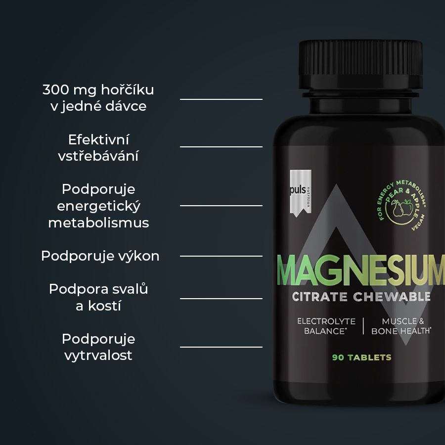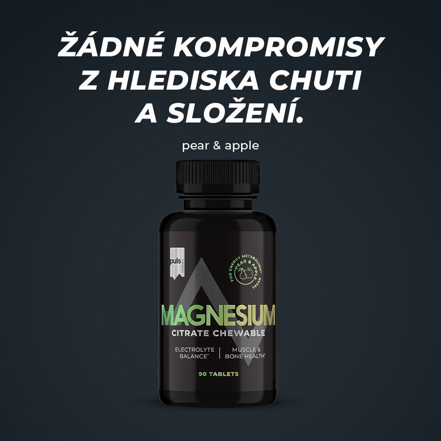 MAGNESIUM CITRATE CHEWABLEDoplněk stravy. Se sladidly sorbitol, fruktóza a steviol-glykosidy. SEVERSKÁ KVALITA BEZ KOMPROMISU Energie a výkon. Podpořte důležité funkce svého těla se žvýkacím hořčíkem PULS. Žvýkací tablety obsahují organický citrát hořečnatý, který podporuje normální energetický metabolismus i správnou funkci svalů a nervové soustavy. Vysoce biologicky dostupná forma umožňuje tělu rychle a efektivně využít potřebné množství hořčíku. Hořčík také hraje klíčovou roli při regulaci rovnováhy elektrolytů. Pokud je hladina hořčíku dostatečná, elektrolyty v těle zůstávají v rovnováze. Tyto vegan-friendly žvýkací tablety odstraňují nutnost polykání klasických tablet nebo kapslí, takže je snadné doplnit hořčík i během těch nejrušnějších dnů. Pochutnáte si na lahodné příchuti hrušky a jablka. Žádné kompromisy z hlediska jedinečné chuti a složení. Finská značka PULS NUTRITION patří ve všech ohledech k absolutní špičce sportovní a doplňkové výživy. 300 mg hořčíku v jedné dávce Efektivní vstřebávání Podporuje energetický metabolismus Podporuje výkon Rovnováha elektrolytů Podpora svalů a kostí Důležitý pro normální funkci svalů a nervové soustavy Podporuje vytrvalost Vhodné pro vegany Skvělá příchuť hruška-jablko PULS NUTRITION - FUEL FOR THE PASSIONATE ONES O značce Inspirujeme naše zákazníky, aby v každodenním životě dělali ta nejlepší rozhodnutí. PULS vznikl ve Finsku z potřeby skloubit hektický a aktivní životní styl se zdravou a výživnou stravou. V PULS věříme, že sportovní výživa a nápoje nejsou určeny jen vrcholovým sportovcům. Pokud se používají správně, mohou fyzicky i psychicky prospět každému, kdo potřebuje v běžném dni trochu povzbuzení nebo energetický přísun. Naše poslání Naším posláním je dodávat životu energii prostřednictvím sportovní výživy. Nabízíme chutné a funkční produkty navržené tak, aby podpořily a pomohly naplno rozvinout váš potenciál. Naše hodnoty Kvalita je naší hlavní prioritou. Chuť - Naše produkty musí vždy skvěle chutnat. V tomto směru neděláme žádné kompromisy. Zdraví a benefity - Všechny naše produkty jsou zdravější volbou. Ne všechny jsou však bez obsahu cukru, bezlepkové či veganské — protože nejsme striktní a jsme ochotni ke kompromisu, pokud přináší přidanou hodnotu. Dostupnost - Naším cílem je, aby byly naše produkty snadno dostupné — ať už ve vašem místním obchodě, nebo pohodlně online. Dostupná cena - Za kvalitní produkty není nutné utrácet jmění. Chceme nabízet nejlepší poměr ceny a kvality na trhu, aniž bychom dělali kompromisy v oblasti kvality či bezpečnosti. Balení: 90 žvýkacích tablet (180 g) Dávkování: užívejte dvě žvýkací tablety denně. Vložte do úst a nechte tabletu rozpustit. Balení obsahuje 45 denních dávek. Upozornění: Není náhrada pestré stravy. Nepřekračujte doporučenou denní dávku (nadměrná konzumace může mít projímavý účinek). Skladujte v suchu, chladu, mimo dosah dětí. Chraňte před světlem. Aktivní látky v 1 tabletě ve 2 tabletách Hořčík 150 mg (40 % RHP*) 300 mg (80 % RHP*) *% RHP—referenční hodnota příjmu vitamínů a minerálních látek. Složení: hořečnaté soli kyseliny citrónové (citrát hořečnatý), sladidla (sorbitol, fruktóza, steviol-glykosidy ze stévie), leštící látka hořečnaté soli mastných kyselin, aroma.
