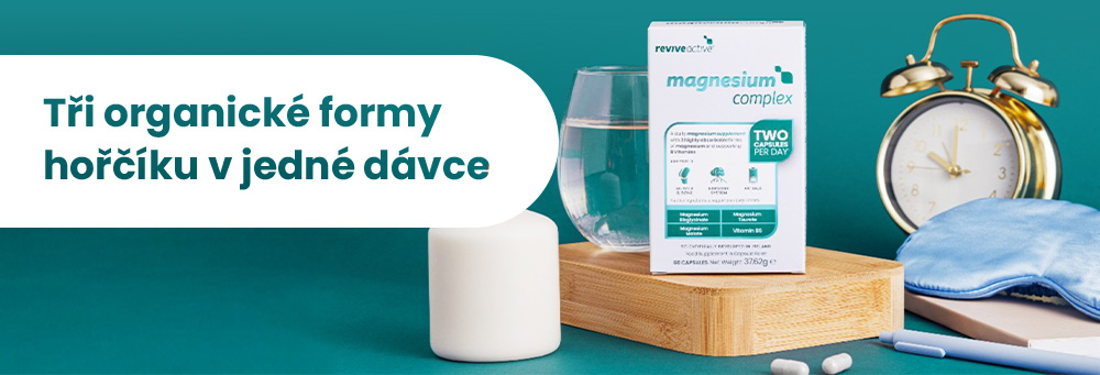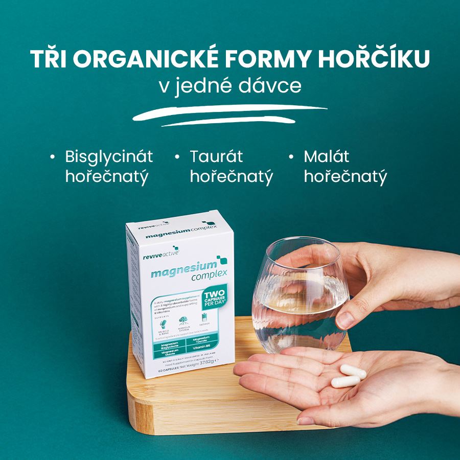 MAGNESIUM COMPLEX Doplněk stravy. Magnesiový doplněk stravy s obsahem tří organických forem hořčíku v jedné dávce. Magnesium Complex obsahuje tři organické bioaktivní formy hořčíku - bisglycinát hořečnatý, taurát hořečnatý a malát hořečnatý, vitamín B1 a B6. Tyto složky poskytují efektivní podporu pro svaly, nervový systém a energetický metabolismus. Magnesium Complex je vhodný pro aktivní sportovce i pro všechny vystavené psychické nebo fyzické zátěži a stresu. Magnesium Complex neobsahuje syntetické složky jako stearan hořečnatý a je v rostlinné kapsli. ZAMĚŘENÍ PRODUKTU Svaly Nervový systém Energetický metabolismus a únava Bisglycinát hořečnatý 600 mg - organická forma, kde je hořčík spojený chelátovou vazbou s aminokyselinou glycin, která zklidňuje nervovou soustavu, prospívá zažívacímu traktu, svalům a tvorbě kolagenu Taurát hořečnatý 400 mg - organická forma, kde je hořčík spojený chelátovou vazbou s aminokyselinou taurin, která podporuje srdce a mitochondrie Malát hořečnatý 250 mg - organická forma, kde je hořčík spojený chelátovou vazbou s kyselinou jablečnou, která se podílí na tvorbě energie v citrátovém cyklu Vitamín B6 4,2 mg - podpora vstřebání hořčíku, podpora energetického metabolismu Vitamín B1 1,1 mg - podpora energetického metabolismu Biologicky aktivní složky ve 2 kapslích POVOLENÁ ZDRAVOTNÍ TVRZENÍ podle Nařízení Evropské komise č. 432/2012 Hořčík přispívá ke snížení míry únavy a vyčerpání / Hořčík přispívá k elektrolytické rovnováze / Hořčík přispívá k normálnímu energetickému metabolismu / Hořčík přispívá k normální činnosti nervové soustavy / Hořčík přispívá k normální činnosti svalů / Hořčík přispívá k normální syntéze bílkovin / Hořčík přispívá k normální psychické činnosti / Hořčík přispívá k udržení normálního stavu kostí / Hořčík přispívá k udržení normálního stavu zubů / Hořčík se podílí na procesu dělení buněk. CERTIFIKÁTY A UDRŽITELNOST Vlastní výroba v našich dvou nejmodernějších výrobnách v Irsku. Sáčky a stickpacky jsou hermeticky uzavřeny, aby poskytovaly bariéru proti světlu, vlhkosti a jiné vnější kontaminaci a udržovaly integritu a účinnost aktivních složek. Výrobní závody Revive Active jsou certifikovány podle standardu BRCGS Global Food Safety V9, Grade AA, s počáteční certifikací získanou v květnu 2023. BRCGS Global Food Safety Standard poskytuje rámec pro řízení bezpečnosti produktů, integritu, zákonnost, kvalitu a provozní kontroly pro tato kritéria v potravinářském průmyslu. Revive Active se snaží fungovat ekologicky, s vědomím splnění standardů ESG s prvotní identifikací základní úrovně uhlíku, identifikovanými emisemi uhlíku v rozsahu 1 a rozsahu 2 a hodnocení dopadu BCorp B v procesu. Cílem je dosáhnout členství v BCorp. O ZNAČCE REVIVE ACTIVE Revive Active je v současné době nejsilnější značkou vitamínových a potravinových doplňků v Irsku. Vznikla v roce 2011, její zakladatel a v současné době výkonný ředitel Daithi O'Connor byl motivován cílem poskytnout lidem spektrum vědecky podložených suplementů, které skutečně fungují. Vybudoval kolem sebe tým expertů z pole vědy, výživy, vývoje a výzkumu. Revive Active se postupně rozrostla a nyní exportuje do 48 zemí světa. Výzkumný tým Revive Active spolupracuje s lídry v oblasti zdraví a výživy jako je například Kerry Group, pro výsledky v podobě inovativních produktů s opravdovými účinky. Jsou připravovány a baleny ve výrobním zařízení v Mullingaru, kraji Westmeath v Irsku. Kontrola našeho dodavatelského řetězce znamená, že vždy dodržujeme přední průmyslové standardy. Naše doplňky jsou navrženy tak, aby kombinovaly aktivní složky, které mají největší účinek pro každou věkovou skupinu v její konkrétní životní fázi. Prostřednictvím doplňkové výživy tak můžete s jistotou čelit výzvám, ať už ve škole, v práci nebo při hře. Upřímně rozumíme výzvám, kterým naši zákazníci čelí, staráme se o ně a pomáháme jim změnit to, jak se cítí a jak se zapojují do světa. Etika - důvěra a udržitelnost vedou naši neúnavnou snahu o co nejlepší produkty pro naše zákazníky.. Balení: 60 kapslí (37,62 g) Dávkování: 1 x 2 kapsle denně. Užívejte s jídlem, kdykoli během dne. Děti od 12 let 1 kapsle denně. Upozornění: Není náhrada pestré stravy. Nepřekračujte doporučenou denní dávku. Skladujte v suchu a chladu, mimo dosah dětí a přímého slunce. Pokud užíváte pravidelně léky nebo jste těhotná či kojící žena, konzultujte užívání s lékařem. Nevhodné pro děti. Aktivní látky: na 2 kapsle (% RHP*) Formy hořčíku: Bisglycinát hořečnatý 600 mg Taurát hořečnatý 400 mg Malát Hořečnatý 250 mg Elementární hořčík celkem 250 mg (67 %*) Vitamín B6 2,8 mg (200 %*) Vitamín B1 (thiamin) 0,44 mg (40 %*) *% RHP—referenční hodnota příjmu vitamínů a minerálních látek. Složení: Bisglycinát hořečnatý, taurát hořečnatý, malát hořečnatý, vitamín B6 (pyridoxin-hydrochlorid), vitamín B1 (thiamin-hydrochlorid), obal rostlinná kapsle (hydroxypropylmethyl-celulóza), protispékavá látka (extrakt z hnědé rýže).