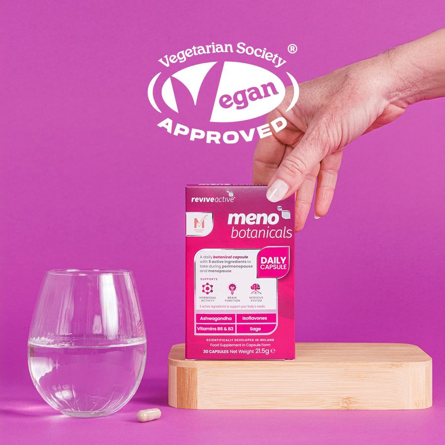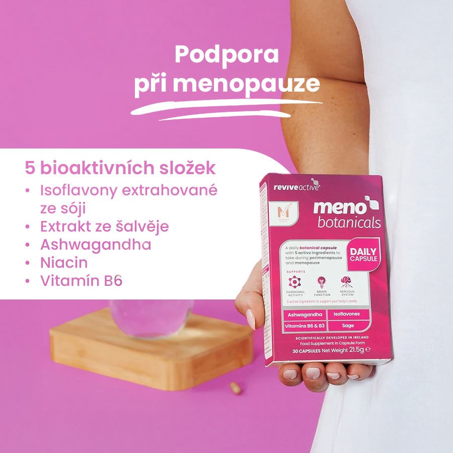 MENO BOTANICALS Doplněk stravy. Unikátní směs rostlinných extraktů a vitamínů pro menopauzu s obsahem pěti přesně cílených složek pečlivě vybraných od prověřených a celosvětově uznávaných producentů. Žádné balastní složky, umělá sladidla a pojiva. Meno Botanicals byl vyvinut špičkovými odborníky a farmaceuty a to s cíleným požadavkem na nejvyšší možnou sílu a využitelnost jednotlivých složek, které vzájemně umocňují svůj účinek. ZAMĚŘENÍ PRODUKTU Hormony Funkce Emoční stabilita Pocení Ashwagandha 450 mg - extrakt z kořene, adaptogen pro odolnost a stabilitu. Isoflavony extrahované ze sóji 135 mg - extrakt standardizovaný na 40 % genisteinu, zdroj isoflavonů, přírodních fytoestrogenů. Šalvěj 100 mg - extrakt z listů, zdroj přírodních fytoestrogenů. Niacin (vitamín B3) 20 mg - pregulace hormonální aktivity, podpora nervové soustavy, energetického metabolismu. Vitamín B6 10 mg - podpora nervové soustavy, energetického metabolismu, vzhledu a sliznic. * Biologicky aktivní složky v 1 kapsli PRO NÁROČNÉ OBDOBÍ MENOPAUZY Meno Botanicals je sestavený speciálně pro všechny ženy procházející náročným obdobím menopauzy. Obsahuje celkem 5 bioaktivních složek pokrývajících ty nejdůležitější oblasti spojené s menopauzou. Meno Botanicals poskytuje podporu pro oblast hormonů, nervovou soustavu a mozek. Účinky souvisí zejména s pocením a psychickou pohodou. To vše bez obsahu umělých sladidel a s minimalizovaným obsahem balastních aditiv. Meno Botanicals je určený zejména pro emoční stabilitu, pocit relaxace a při pocení. Pro komplexní podporu zahrnující i další oblasti je vhodnější produkt Meno Active. Meno Botanicals lze kombinovat s produktem Calm pro posílení emoční stability během dne nebo s produktem Sleep pro zlepšení kvality spánku. JAK UŽÍVAT MENO BOTANICALS Užívejte jednu kapslí denně Nejlépe před nebo s jídlem Lze užívat kdykoliv během dne Povolená zdravotní tvrzení podle Nařízení Evropské komise č. 432/2012 Vitamin B6 přispívá k regulaci hormonální aktivity / Niacin přispívá k normální činnosti nervové soustavy / Vitamin B6 přispívá k normální činnosti nervové soustavy / Niacin přispívá k udržení normálního stavu pokožky / Niacin přispívá k udržení normálního stavu sliznic CERTIFIKÁTY A UDRŽITELNOST Vlastní výroba v našich dvou nejmodernějších výrobnách v Irsku. Sáčky a stickpacky jsou hermeticky uzavřeny, aby poskytovaly bariéru proti světlu, vlhkosti a jiné vnější kontaminaci a udržovaly integritu a účinnost aktivních složek. Výrobní závody Revive Active jsou certifikovány podle standardu BRCGS Global Food Safety V9, Grade AA, s počáteční certifikací získanou v květnu 2023. BRCGS Global Food Safety Standard poskytuje rámec pro řízení bezpečnosti produktů, integritu, zákonnost, kvalitu a provozní kontroly pro tato kritéria v potravinářském průmyslu. Revive Active se snaží fungovat ekologicky, s vědomím splnění standardů ESG s prvotní identifikací základní úrovně uhlíku, identifikovanými emisemi uhlíku v rozsahu 1 a rozsahu 2 a hodnocení dopadu BCorp B v procesu. Cílem je dosáhnout členství v BCorp. O ZNAČCE REVIVE ACTIVE Revive Active je v současné době nejsilnější značkou vitamínových a potravinových doplňků v Irsku. Vznikla v roce 2011, její zakladatel a v současné době výkonný ředitel Daithi O'Connor byl motivován cílem poskytnout lidem spektrum vědecky podložených suplementů, které skutečně fungují. Vybudoval kolem sebe tým expertů z pole vědy, výživy, vývoje a výzkumu. Revive Active se postupně rozrostla a nyní exportuje do 48 zemí světa. Výzkumný tým Revive Active spolupracuje s lídry v oblasti zdraví a výživy jako je například Kerry Group, pro výsledky v podobě inovativních produktů s opravdovými účinky. Jsou připravovány a baleny ve výrobním zařízení v Mullingaru, kraji Westmeath v Irsku. Kontrola našeho dodavatelského řetězce znamená, že vždy dodržujeme přední průmyslové standardy. Naše doplňky jsou navrženy tak, aby kombinovaly aktivní složky, které mají největší účinek pro každou věkovou skupinu v její konkrétní životní fázi. Prostřednictvím doplňkové výživy tak můžete s jistotou čelit výzvám, ať už ve škole, v práci nebo při hře. Upřímně rozumíme výzvám, kterým naši zákazníci čelí, staráme se o ně a pomáháme jim změnit to, jak se cítí a jak se zapojují do světa. Etika - důvěra a udržitelnost vedou naši neúnavnou snahu o co nejlepší produkty pro naše zákazníky.. Balení: 30 kapslí (21,5 g) Dávkování: berte 1 kapsli denně před jídlem nebo s jídlem, zapijte sklenicí vody. Upozornění: Není náhrada pestré stravy. Nepřekračujte doporučenou denní dávku. Skladujte v suchu a chladu, mimo dosah dětí a přímé slunce. Pokud užíváte pravidelně léky nebo jste těhotná či kojící žena, konzultujte užívání s lékařem. Lze užívat současně s hormonální substituční léčbou. Aktivní látky: na 1 kapsli (% RHP*) Extrakt z kořene Ashwagandhy 450 mg Extrakt ze sójových bobů 135 mg poskytuje 40 % genisteinu 54 mg Extrakt z listů šalvěje 100 mg Niacin (vitamín B3) 20 mg (125 %*) Vitamín B6 10 mg (714 %*) Složení: Extrakt z kořene Ashwagandhy (Withania somnifera), extrakt ze sójových bobů (standardizován na 40% obsah genisteinu), extrakt z listů šalvěje (Salvia officinalis), vitamín B3 (nikotinamid), vitamín B6 (pyridoxin-hydrochlorid), rostlinná kapsle (hydroxypropylmethylcelu-lóza), protispékavá látka (extrakt z hnědé rýže).