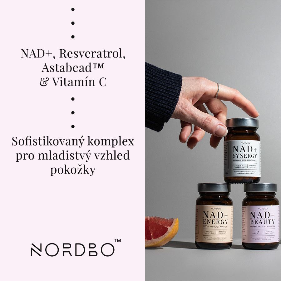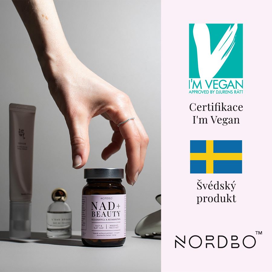 NAD+ BEAUTY Doplněk stravy.- SOFISTIKOVANÝ KOMPLEX PRO MLADISTVÝ VZHLED POKOŽKY- NAD+ ve formě prekurzoru nikotinamid ribosid chloridu (bioaktivní forma vitamínu B3)- Resveratrol (extrahovaný z Křídlatky japonské)- Astaxanthin Astabead™ (extrakt z řasy Haematococcus pluvialis)- Vitamín C (askorbát vápenatý)- Certifikát I'm Vegan organizace Djurens Rätt (Animal Rights)- Produkt neobsahuje živočišné složky, pojiva a nežádoucí balastní složky- NORDBO = kvalita a klinicky prověřené zdroje + udržitelnost a etická odpovědnost Nordbo NAD+ Beauty je synergický komplex pro péči o pleť obsahující čtyři aktivní složky - nikotinamid ribosid chlorid (NR), resveratrol získaný z rostliny Křídlatka japonská, astaxanthin značky AstaBead® získaný z řasy Haematococcuspluvialis a vitamin C ve formě askorbátu vápenatého, který je šetrný pro trávicí trakt a velmi dobře vstřebatelný.NR se v těle přeměňuje na aktivní koenzym NAD+ a přispívá k normálnímu energetickému metabolismu. Resveratrol je rostlinný polyfenol a oblíbená složka používaná v péči o pleť jak vnitřně, tak zevně. AstaBead® je standardizovaný extrakt astaxanthinu získaný z mikrořas. Studie ukazují, že astaxanthin přispívá ke zlepšení struktury pokožky, zvýšení její hydratace a snížení hloubky jemných vrásek. Vitamin C přispívá k normální tvorbě kolagenu a pomáhá chránit buňky před oxidačním stresem.Obsažené složky:- Nikotinamid ribosid chlorid (NR) - prekurzor NAD+ (nikotinamidadenindinukleotidu), důležitého koenzymu přítomného ve všech živých buňkách. NAD+ hraje klíčovou roli v buněčných energetických procesech, opravě DNA a udržování stavu buněk. S přibývajícím věkem hladina NAD+ klesá, což může funkci buněk negativně ovlivňovat. Doplněním NR může tělo zvýšit produkci NAD+, což podporuje normální energetický metabolismus a přispívá ke zlepšení stavu pokožky, včetně její pružnosti a zářivého vzhledu.- Resveratrol je přírodní polyfenol a silný antioxidant, který se nachází v rostlinách, jako jsou červené hrozny nebo křídlatka japonská. V péči o pleť je široce využíván díky své schopnosti chránit pokožku před vnějšími stresovými faktory, podporovat obnovu buněk a snižovat oxidační stres. Resveratrol může přispět k sjednocení tónu pleti a zvýšení jejího přirozeného jasu.- AstaBead™ je standardizovaný extrakt astaxanthinu získaný z mikrořasy Haematococcus pluvialis. AstaBead™ obsahuje 5 % přírodního astaxanthinu, technologie Beadlet zajišťuje stabilitu a optimální biologickou dostupnost. Astaxanthin patří mezi nejsilnější přírodní antioxidanty a má prokázané účinky na zlepšení struktury pokožky, udržení její hydratace a nápravu jemných linek a vrásek. Zároveň pomáhá chránit pokožku před poškozením způsobeným UV zářením a podporuje elasticitu pleti.- Askorbát vápenatý je kyselinově neutrální forma vitaminu C, která je šetrná k žaludku. Vitamin C je nezbytný pro normální tvorbu kolagenu a přispívá k normální funkci a struktuře pokožky. Zároveň je silným antioxidantem, který chrání buňky před oxidačním stresem způsobeným volnými radikály, a tím pomáhá zachovat zdraví a přirozený jas pleti.Povolená zdravotní tvrzení podle Nařízení Evropské komise č. 432/2012: Vitamin C přispívá k normální tvorbě kolagenu pro normální funkci kůže / Vitamin C přispívá k ochraně buněk před oxidativním stresem. Certifikace I'm VeganCertifikát I'm Vegan uděluje švédská organizace Djurens Rätt (Animal Rights), která garantuje, že produkt je 100% rostlinného původu a při jeho výrobě nebyly použity žádné živočišné složky. Certifikát se uděluje potravinám, doplňkům stravy, hygienickým produktům a kosmetice. I'm Vegan představuje jednoduchou cestu, jak si spotřebitel může být jistý, že značka nebo produkt splňuje standarty organizace Djurens Rätt.O certifikátu1. Djurens Rätt vznikla v roce 1882 a nyní je švédskou vedoucí organizací v oblasti ochrany zvířat. Jde o politicky nezávislou organizaci, která se zaměřuje na zvýšení ochrany zvířat v domácím i mezinárodním měřítku.2. Produkty s označením I'm Vegan musí být 100% rostlinné. Je u nich zakázáno testování na zvířatech a nesmí být použity žádné živočišné složky nebo živočišné deriváty.3. Značka musí pro udělení certifikátu doložit veškerou dokumentaci, aby byl 100% prověřen původ produktu.O značce NordboNORDBO je švédská značka, jejíž filozofie je založena na dvou pilířích: kvalita a klinická dokumentace + udržitelnost a etická odpovědnost. Značka spojuje severskou tradici a kvalitu, se smysluplnou inovací a čistotou použitých složek = inovativní vývoj klasických doplňků, lepšími způsoby. Skvělým příkladem je nativní rybí tuk Nordbo, který pochází z lokální skandinávské produkce a je vyroben ze 100% udržitelných zdrojů. S produkty Nordbo máte 100% jistotu, že při jejich výrobě bylo vždy myšleno na maximální možnou funkčnost, kvalitu zdrojových surovin a zároveň na ohleduplnost k životnímu prostředí. Všechny produkty Nordbo za sebou mají buď certifikáty ASC (Aqua Stewardship Council) nebo I'm Vegan. Všechny jsou navíc vyrobené podle standardů GMP (Good Manufacturing Practices). Pro papírové obaly je použitý recyklovaný papír FSC (Forest Stewardship Council).NORDBO = švédské doplňky stravy založené na dvou pilířích:1. Kvalita a klinicky prověřené zdroje2. Udržitelnost a etická odpovědnostProdukty Nordbo jsou vyrobené s maximálním možným ohledem na životní prostředí. Při jejich výrobě je dbáno na udržitelnou produkci, co nejmenší stopu CO2 a na užití recyklovatelných materiálů - 