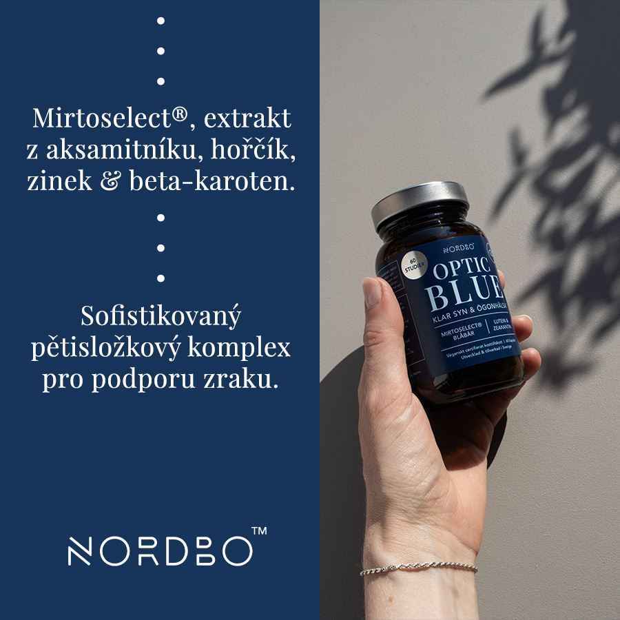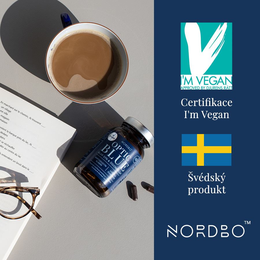 OPTIC BLUE (MIRTOSELECT® BILBERRY EXTRACT + LUTEIN + ZEAXANTHIN) Doplněk stravy - SOFISTIKOVANÝ PĚTISLOŽKOVÝ KOMPLEX PRO PODPORU ZRAKU- Mirtoselect® - extrakt z borůvek (efektivní a všestranná podpora funkce oka)- Mirtoselect® = nejprostudovanější extrakt z borůvek na světě- Aksamitník vzpřímený - extrakt s obsahem luteinu (15 mg / 2 kapsle) a zeaxanthinu (750 µg / 2 kapsle)- Lutein + zeaxanthin (ochrana funkce oka a rohovky)- Hořčík (bisglycinát hořečnatý) - 30 mg / 2 kapsle- Zinek (pikolinát zinečnatý) - 1,5 mg / 2 kapsle- Beta karoten ( z toho vitamín A 200 µg / 2 kapsle)- Certifikát I'm Vegan organizace Djurens Rätt (Animal Rights)- Produkt neobsahuje živočišné složky, pojiva a nežádoucí balastní složky- NORDBO = kvalita a klinicky prověřené zdroje + udržitelnost a etická odpovědnost Nordbo Optic Blue je doplněk určený pro podporu stavu očí a zraku. Obsahuje Mirtoselect®, extrakt z aksamitníku, hořčík, zinek a beta-karoten.Mirtoselect® je nejvíce studovaný extrakt z borůvek na světě, který obsahuje 36 % antokyaninů, silných přírodních sloučenin s výrazným antioxidačním účinkem. Jeho výživová hodnota je zaručena metodou zvanou HPLC analýza. Extrakt z borůvek přispívají k funkci očí, čistému vidění a ochraně zraku. Extrakt z aksamitníku obsahuje lutein a zeaxantin, které se přirozeně vyskytují v sítnici. Beta-karoten je prekurzorem vitamínu A. Vitamín A a zinek přispívají k udržení normálního vidění. Mirtoselect® je nejvíce studovaný extrakt z borůvek na světě. Od začátku jeho vývoje v 70. letech byl zkoumán ve více než 60 pozitivních studiích, z nichž polovina byla publikována v recenzovaných vědeckých časopisech. Mirtoselect® má standardizovaný obsah 36 % antokyaninů (flavonoidů, tedy antioxidantů). Výživová hodnota je zaručena metodou HPLC analýzy – pokročilou formou kapalinové chromatografie. Borůvky (také známé jako plané evropské borůvky) se sbírají v severní Evropě mezi červencem a zářím. Aksamitník vzpřímený (Aztec marigold) je kvetoucí rostlina obsahující karotenoidy (tuky rozpustné pigmenty) lutein a zeaxantin. Obsažené složky - Mirtoselect® - zvyšuje schopnost rozlišovat detaily při nízkém kontrastu, chrání buňky v oku před působením volných radikálů, podporuje sítnici, zlepšuje tvorbu slz u suchých očí, podporuje cévy a přísun kyslíku do očí- Lutein pomáhá chránit oči a přirozeně se vyskytuje v sítnici. Nedostatek luteinu může ovlivnit schopnost oka jasně vidět.- Zeaxantin pomáhá chránit oči před UV zářením, modrým světlem a volnými radikály. Přirozeně se nachází ve žluté skvrně (makule) – části sítnice odpovědné za ostrost a detail vidění. Změny v makule vedou ke snížení zrakové ostrosti.- Beta-karoten je karotenoid a prekurzor vitamínu A. Vitamín A a zinek přispívají k udržení normálního vidění. Vitamín A rovněž pomáhá udržovat normální stav sliznic Povolená zdravotní tvrzení podle Nařízení Evropské komise č. 432/2012 / on hold seznamu: Borůvky (Vaccinium myrtillus) - Normální stav zraku - antioxidant (ID 2001) / Borůvky (Vaccinium myrtillus) - normální činnost cévní soustavy (ID 2002) / Vitamin A přispívá k udržení normálního stavu zraku.Certifikace I'm VeganCertifikát I'm Vegan uděluje švédská organizace Djurens Rätt (Animal Rights), která garantuje, že produkt je 100% rostlinného původu a při jeho výrobě nebyly použity žádné živočišné složky. Certifikát se uděluje potravinám, doplňkům stravy, hygienickým produktům a kosmetice. I'm Vegan představuje jednoduchou cestu, jak si spotřebitel může být jistý, že značka nebo produkt splňuje standarty organizace Djurens Rätt. O certifikátu1. Djurens Rätt vznikla v roce 1882 a nyní je švédskou vedoucí organizací v oblasti ochrany zvířat. Jde o politicky nezávislou organizaci, která se zaměřuje na zvýšení ochrany zvířat v domácím i mezinárodním měřítku.2. Produkty s označením I'm Vegan musí být 100% rostlinné. Je u nich zakázáno testování na zvířatech a nesmí být použity žádné živočišné složky nebo živočišné deriváty.3. Značka musí pro udělení certifikátu doložit veškerou dokumentaci, aby byl 100% prověřen původ produktu.O značce NordboNORDBO je švédská značka, jejíž filozofie je založena na dvou pilířích: kvalita a klinická dokumentace + udržitelnost a etická odpovědnost. Značka spojuje severskou tradici a kvalitu, se smysluplnou inovací a čistotou použitých složek = inovativní vývoj klasických doplňků, lepšími způsoby. Skvělým příkladem je nativní rybí tuk Nordbo, který pochází z lokální skandinávské produkce a je vyroben ze 100% udržitelných zdrojů. S produkty Nordbo máte 100% jistotu, že při jejich výrobě bylo vždy myšleno na maximální možnou funkčnost, kvalitu zdrojových surovin a zároveň na ohleduplnost k životnímu prostředí. Všechny produkty Nordbo za sebou mají buď certifikáty ASC (Aqua Stewardship Council) nebo I'm Vegan. Všechny jsou navíc vyrobené podle standardů GMP (Good Manufacturing Practices). Pro papírové obaly je použitý recyklovaný papír FSC (Forest Stewardship Council).NORDBO = švédské doplňky stravy založené na dvou pilířích:1. Kvalita a klinicky prověřené zdroje2. Udržitelnost a etická odpovědnostProdukty Nordbo jsou vyrobené s maximálním možným ohledem na životní prostředí. Při jejich výrobě je dbáno na udržitelnou produkci, co nejmenší stopu CO2 a na užití recyklovatelných materiálů - produkty jsou zabalené v krabičkách z recyklovaného papíru. Nordbo se zároveň snaží užívat co nejméně plastu a různých nadbytečných reklamních předmětů. Naopak se snaží o minimalismus a střídmost. Na prvním 