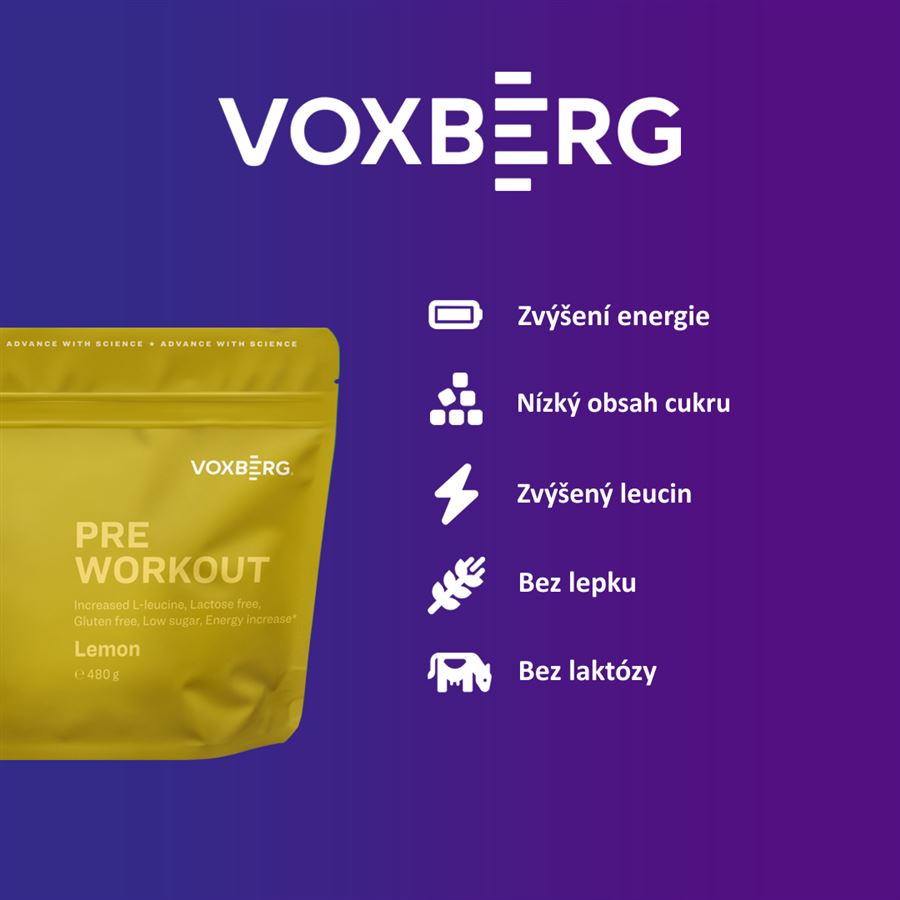 PRE-WORKOUT Doplněk stravy se sladidlem. S obsahem kofeinu (72 mg/ 20 g dávka). Není vhodné pro děti, těhotné a kojící ženy. 7složkový předtréninkový komplex se syrovátkovým izolátem a yerba maté. Pre-Workout není další obyčejný pre-workout. Výrazně oddaluje únavu tím, že dodává tělu už před tréninkem bílkoviny (syrovátkový izolát) a aminokyseliny (L-glutamin, L-leucin, beta-alanin, L-arginin-alfa-ketoglutarát 2:1) a kromě toho obsahuje výtažky z Yerba Maté a ženšenu podporující fyzický výkon a koncentraci. Yerba maté narozdíl od čistého kofeinu povzbuzuje po delší dobu a plynuleji a navíc zlepšuje soustředění, což je klíčové u mnoha druhů sportu. Nepřichází také nepříjemný útlum typický například pro kávu. Pre-workout v bodech: - Extrakt z Yerba Maté - přírodní zdroj kofeinu, který povzbuzuje, zlepšuje koncentraci a zvyšuje metabolickou aktivitu, čímž napomáhá spalování tuků.- Energie po celou dobu tréninku - Na rozdíl od syntetických energizérů se kofein v Yerba Maté uvolňuje postupně, což znamená delší trvání energie.- Ochrana svalů - obsahuje syrovátkový proteinový izolát, který poskytuje rychle stravitelné bílkoviny nezbytné pro regeneraci a růst svalů.- Pomocník pro regeneraci - L-glutamin a L-leucin podporují regeneraci svalů, zvyšují syntézu bílkovin a pomáhají udržovat svalovou hmotu.- Oxidativní stres - ženšen podporuje celkovou vitalitu a pomáhá proti únavě- Umožňuje intenzivnější trénink - Beta-alanin a L-arginin zlepšují vytrvalost a snižují svalovou únavu, což umožňuje delší a intenzivnější trénink- Nejkvalitnější suroviny - bílkoviny používané k výrobě Pre-Workout pocházejí z Evropské Unie a jejich kvalita je přísně kontrolována Proč Voxberg? - Prémiová slovenská značka - Přímý výrobce - vlastní vývoj a výzkum- Reschers Food Innovations - spolupráce s prestižními institucemi- Nejnovější vědecké poznatky v praxi- IFS certifikace a autorizace- Kontrola celého výrobního procesu- Využití surovin s nejvyšším ratingem Balení: 480 g Dávkování: 20 g prášku (1 odměrku) smíchejte s 200 - 250 ml vody (doporučuje se studená), protřepejte minimálně po dobu 15 až 20 sekund a vypijte. Balení obsahuje 24 dávek. Upozornění: Nevhodné pro děti, těhotné a kojící ženy. Nevhodné pro fenylketonuriky. Nevhodné pro osoby alergické (přecitlivělé) na některé z látek uvedených ve složení produktu. Nezapomínejte na význam pestré a vyvážené stravy. Může obsahovat lepek, vejce, sóju, sezam, arašídy a skořápkové plody. Výživové údaje: ve 100 g ve 20 g* Energetická hodnota 978 kJ / 230 kcal 196 kJ / 46 kcal Tuky <0,5 g <0,5 g z toho nasycené mastné kyseliny 0,1 g <0,1 g Sacharidy 1,3 g <0,5 g z toho cukry 1,3 g <0,5 g Bílkoviny 56 g 11,2 g Sůl 0,6 g 0,12 g Obsah esenciálních aminokyselin ve 100 g ve 20 g* L-glutamin 12655 mg 2531 mg L-leucin 15267 mg 3053 mg Beta alanin 10221 mg 2044 mg L-arginin-alfa-ketoglutarát 8957 mg 1791 mg Yerba Mate extrakt z listů (Ilex Paraguariensis) 1791 mg 358 mg z toho kofein 358 mg 72 mg Ženšen extrakt z kořene (Panax Ginseng C.A. Meyer) 487 mg 97 mg z toho gynsenosidy 97 mg 19 mg *20 g - odpovídá jedné dávce (odměrce) Složení: syrovátkový bílkovinný izolát, L-glutamin, L-leucin, β-alanin, L-arginin-α-ketoglutarát 2:1, kyselina: kyselina citrónová; prášek z červené řepy, yerba mate (Ilex paraguariensis, extrakt z listů) (20 % obsah kofeinu), přírodní aroma, ženšen (Panax ginseng, extrakt z kořene) (20 % obsah ginsenosidů), protispékavá látka: oxid křemičitý; sladidlo: sukraloza.