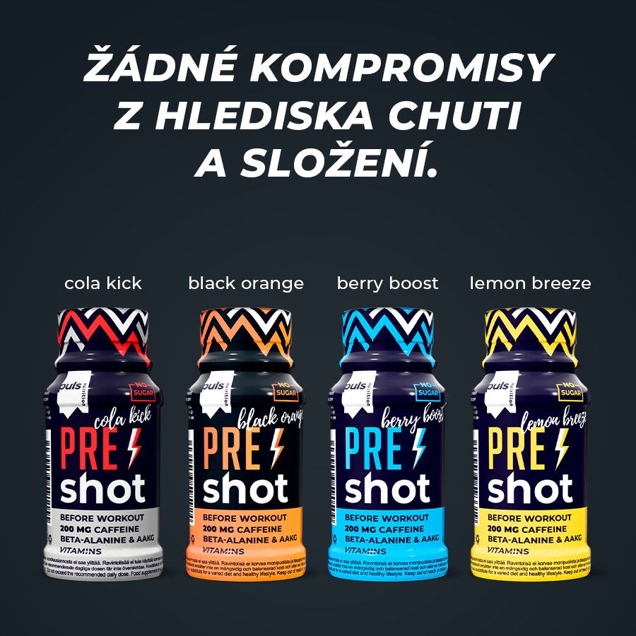 Zažijte chuť černého pomeranče a posuňte své limity se účinkem PULS Pre-Workout Shotu. Tato energetická bomba bez obsahu cukru vás připraví i na ty nejnáročnější tréninky. Vypijte maximálně 30 minut před tréninkem a využijte účinků kofeinu, argininu AKG, beta-alaninu a vitaminů B6 a B12. Pre-Workout Shot obsahuje 200 mg kofeinu na jednu dávku.