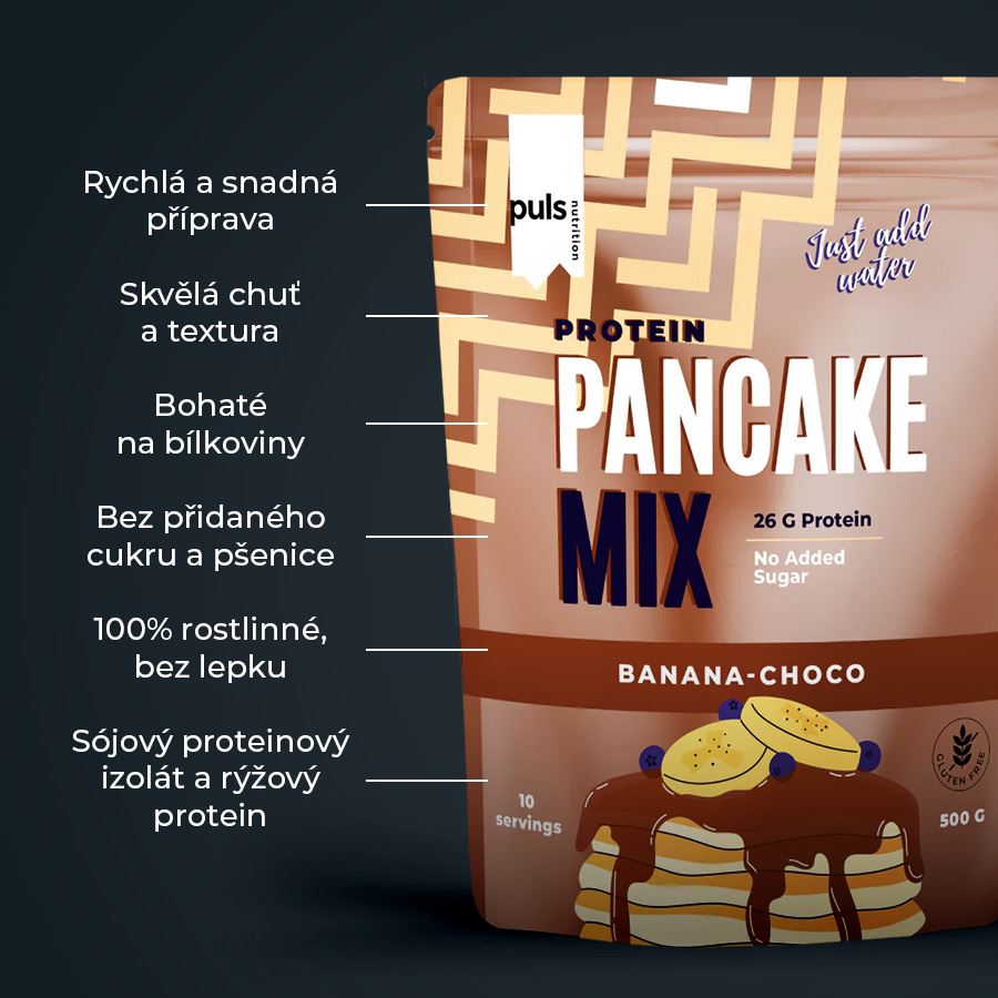 Snadno připravitelné proteinové palačinky. Kompletně rostlinné a kompletně bez lepku. Směs PULS Pancake Mix je ideálním řešením pro rychlou a zdravou svačinu. Za pouhých 10 minut si můžete připravit chutné palačinky bohaté na bílkoviny a plné kvalitních surovin. Směs s příchutí banánu a čokolády obsahuje ovesnou mouku, vysoce kvalitní syrovátkový proteinový koncentrát, sušené odstředěné mléko a izolát vaječných bílkovin. Neobsahuje přidaný cukr ani pšenici.