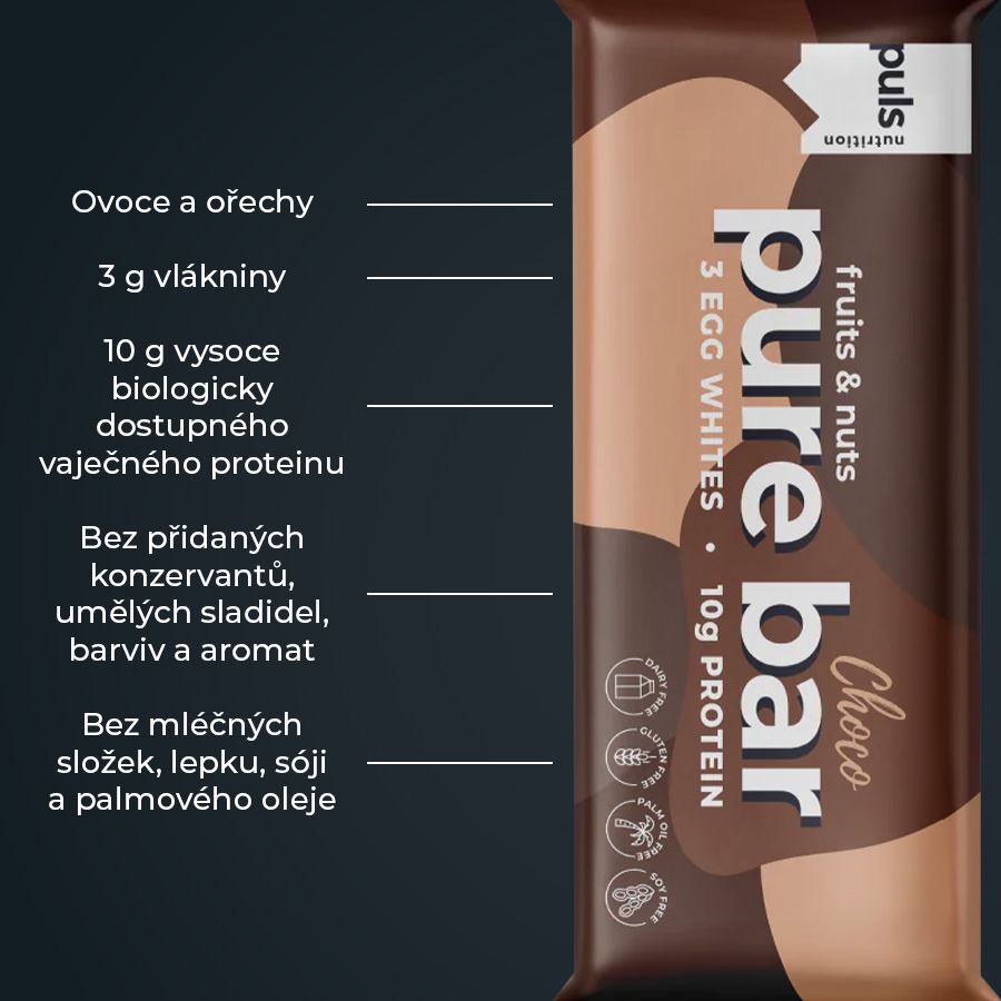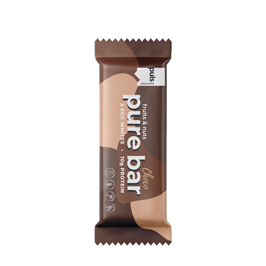 PURE BARProteinová tyčinka. SEVERSKÁ KVALITA BEZ KOMPROMISU Zažijte dokonalou rovnováhu přírodní kvality a proteinové síly. Tato pečlivě vytvořená snacková tyčinka s příchutí čokolády obsahuje 10 g vysoce biologicky dostupného vaječného proteinu s kompletním aminokyselinovým profilem. Pure Bar Choco je navíc obalena v lahodné kombinaci datlí, kešu ořechů, mandlí a čokolády. Výrazný obsah 3 g vlákniny vás udrží déle syté mezi jídly, po tréninku nebo během outdoorových aktivit. Tyčinka je zcela bez lepku a mléčných složek, takže vyhovuje různým stravovacím preferencím. Neobsahuje žádné konzervanty, umělá sladidla ani aromata. Pure Bar poskytuje dlouhotrvající energii z kvalitních a přirozených zdrojů, což z ní činí ideální volbu pro plnohodnotnou výživu na cestách. Žádné kompromisy z hlediska jedinečné chuti, čistoty a složení. Finská značka PULS NUTRITION patří ve všech ohledech k absolutní špičce sportovní a doplňkové výživy. Severská kvalita Ovoce a ořechy 3 g vlákniny 10 g vysoce biologicky dostupného vaječného proteinu Bez přidaných konzervantů, umělých sladidel, barviv a aromat Bez mléčných složek, lepku, sóji a palmového oleje Lahodná chuť a šťavnatá textura Poskytuje dlouhotrvající energii a bílkoviny Plnohodnotná svačina na cesty Příchuť čokoláda PULS NUTRITION - FUEL FOR THE PASSIONATE ONES O značce Inspirujeme naše zákazníky, aby v každodenním životě dělali ta nejlepší rozhodnutí. PULS vznikl ve Finsku z potřeby skloubit hektický a aktivní životní styl se zdravou a výživnou stravou. V PULS věříme, že sportovní výživa a nápoje nejsou určeny jen vrcholovým sportovcům. Pokud se používají správně, mohou fyzicky i psychicky prospět každému, kdo potřebuje v běžném dni trochu povzbuzení nebo energetický přísun. Naše poslání Naším posláním je dodávat životu energii prostřednictvím sportovní výživy. Nabízíme chutné a funkční produkty navržené tak, aby podpořily a pomohly naplno rozvinout váš potenciál. Naše hodnoty Kvalita je naší hlavní prioritou. Chuť - Naše produkty musí vždy skvěle chutnat. V tomto směru neděláme žádné kompromisy. Zdraví a benefity - Všechny naše produkty jsou zdravější volbou. Ne všechny jsou však bez obsahu cukru, bezlepkové či veganské — protože nejsme striktní a jsme ochotni ke kompromisu, pokud přináší přidanou hodnotu. Dostupnost - Naším cílem je, aby byly naše produkty snadno dostupné — ať už ve vašem místním obchodě, nebo pohodlně online. Dostupná cena - Za kvalitní produkty není nutné utrácet jmění. Chceme nabízet nejlepší poměr ceny a kvality na trhu, aniž bychom dělali kompromisy v oblasti kvality či bezpečnosti. Balení: 50 g Upozornění: Uchovávejte v suchu a chladu, mimo dosah slunečního záření a dětí. Výživové údaje: ve 100 g Energetická hodnota 1434 kJ/ 341 kcal Tuky 9 g z toho nasycené mastné kyseliny 3 g Sacharidy 47 g z toho cukry 41 g Bílkoviny 20 g Sůl 0,6 g Složení: datle (původ mimo EU), kešu (původ mimo EU), mandle (původ mimo EU), čokoláda (původ EU i mimo EU) (cukr, kakaová hmota, kakaové máslo, vanilka), vaječný bílek v prášku, kakaový prášek, vanilka, mořská sůl.