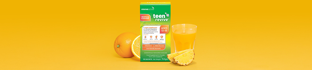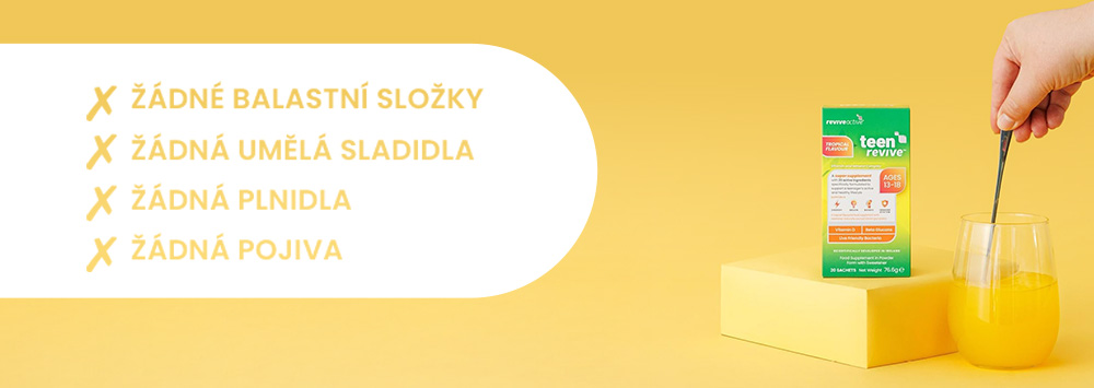 TEEN REVIVE Doplněk stravy, se sladidlem (steviol-glykosidy). Superdoplněk stravy pro dospívající ve věku 13-18 let (vitalita, energie a obranný štít) s obsahem osmi přesně cílených složek pečlivě vybraných od prověřených a celosvětově uznávaných producentů. Žádné balastní složky, umělá sladidla a pojiva. Jednorázové sáčky nabízí snadnou manipulaci a rychlou přípravu chutného instantního nápoje ve formě lahodného džusu. Teen Revive byl vyvinut špičkovými odborníky a farmaceuty a to s cíleným požadavkem na nejvyšší možnou sílu a využitelnost jednotlivých složek, které vzájemně umocňují svůj účinek. KOMPLEXNÍ OCHRANA pro klouby a pohybový aparát Energie Obranný štít Mozek Kosti a pohybový aparát Mikrobiom Extrakt z kořene čekanky 1000 mg - vláknina vyživující mikrobiom. Pekařské kvasinky 50 mg - zdroj beta-glukanů, účinných látek aktivujících obranný štít. Prášek z jablečného, hruškového, ananasového a mrkvového džusu 175 mg - zdroj vitamínů. Bacillus Coagulans 30 mg - prospěšné probiotické kultury. Cholin 10 mg - prekurzor acetylcholinu, psychická činnost. Důležité vitamíny - A, D3, E, K2, C, thiamin, riboflavin, niacin, kyselina pantotenová Důležité minerály - hořčík, železo, zinek, měď, selen * Biologicky aktivní složky v 1 sáčku ALL-IN-ONE Teen Revive je komplexní produkt z kategorie vše v jednom, s obsahem všech nejdůležitějších doplňků stravy v jednom produktu a v jedné denní dávce. Je speciálně sestaven pro dospívající ve věku 13-18 let, pro každodenní podporu i pro podporu během vysoké zátěže - při nástupu do školy, při sportu, na podzim nebo v zimě. Jednorázové sáčky nabízí snadnou manipulaci a rychlou přípravu chutného instantního nápoje ve formě lahodného džusu s příchutí tropické ovoce = ideální, rychlý a účinný začátek pro každý den a plnohodnotný potenciál. To vše bez obsahu umělých sladidel a s minimalizovaným obsahem balastních aditiv. JAK UŽÍVAT TEEN REVIVE ① Otevřete sáček a nasypejte do sklenice ② Přidejte 100 ml vody ③ Zamíchejte a vypíjte Můžete přidat také do ranního smoothie nebo džusu. Užívejte ráno na prázdný žaludek. Povolená zdravotní tvrzení podle Nařízení Evropské komise č. 432/2012 Riboflavin přispívá k normálnímu energetickému metabolismu / Riboflavin přispívá k normální činnosti nervové soustavy / Kyselina pantothenová přispívá k normální mentální činnosti / Kyselina pantothenová přispívá k normálnímu energetickému metabolismu / Kyselina pantothenová přispívá k normální syntéze a metabolismu steroidních hormonů, vitaminu D a některých neurotransmiterů / Kyselina pantothenová přispívá ke snížení míry únavy a vyčerpání / Vitamin B12 přispívá k normální psychické činnosti / Vitamin B12 přispívá k normální funkci imunitního systému / Vitamin B6 přispívá k normální psychické činnosti / Měď přispívá k normální činnosti nervové soustavy / Měď přispívá k normální funkci imunitního systému / Niacin přispívá k normální psychické činnosti / Niacin přispívá k normální činnosti nervové soustavy / Selen přispívá k normální funkci imunitního systému CERTIFIKÁTY A UDRŽITELNOST Vlastní výroba v našich dvou nejmodernějších výrobnách v Irsku. Sáčky a stickpacky jsou hermeticky uzavřeny, aby poskytovaly bariéru proti světlu, vlhkosti a jiné vnější kontaminaci a udržovaly integritu a účinnost aktivních složek. Výrobní závody Revive Active jsou certifikovány podle standardu BRCGS Global Food Safety V9, Grade AA, s počáteční certifikací získanou v květnu 2023. BRCGS Global Food Safety Standard poskytuje rámec pro řízení bezpečnosti produktů, integritu, zákonnost, kvalitu a provozní kontroly pro tato kritéria v potravinářském průmyslu. Revive Active se snaží fungovat ekologicky, s vědomím splnění standardů ESG s prvotní identifikací základní úrovně uhlíku, identifikovanými emisemi uhlíku v rozsahu 1 a rozsahu 2 a hodnocení dopadu BCorp B v procesu. Cílem je dosáhnout členství v BCorp. O ZNAČCE REVIVE ACTIVE Revive Active je v současné době nejsilnější značkou vitamínových a potravinových doplňků v Irsku. Vznikla v roce 2011, její zakladatel a v současné době výkonný ředitel Daithi O'Connor byl motivován cílem poskytnout lidem spektrum vědecky podložených suplementů, které skutečně fungují. Vybudoval kolem sebe tým expertů z pole vědy, výživy, vývoje a výzkumu. Revive Active se postupně rozrostla a nyní exportuje do 48 zemí světa. Výzkumný tým Revive Active spolupracuje s lídry v oblasti zdraví a výživy jako je například Kerry Group, pro výsledky v podobě inovativních produktů s opravdovými účinky. Jsou připravovány a baleny ve výrobním zařízení v Mullingaru, kraji Westmeath v Irsku. Kontrola našeho dodavatelského řetězce znamená, že vždy dodržujeme přední průmyslové standardy. Naše doplňky jsou navrženy tak, aby kombinovaly aktivní složky, které mají největší účinek pro každou věkovou skupinu v její konkrétní životní fázi. Prostřednictvím doplňkové výživy tak můžete s jistotou čelit výzvám, ať už ve škole, v práci nebo při hře. Upřímně rozumíme výzvám, kterým naši zákazníci čelí, staráme se o ně a pomáháme jim změnit to, jak se cítí a jak se zapojují do světa. Etika - důvěra a udržitelnost vedou naši neúnavnou snahu o co nejlepší produkty pro naše zákazníky.. Balení: 20 sáčků (76,6 g) Dávkování: rozpusťte obsah sáčku v 250-300 ml vody a ihned vypijte. Užívejte 1 sáček denně, nejlépe ráno nalačno, před snídaní, 5 x týdně. Upozornění: Není náhrada pestré stravy. Nepřekračujte doporučenou denní dávku. Skla
