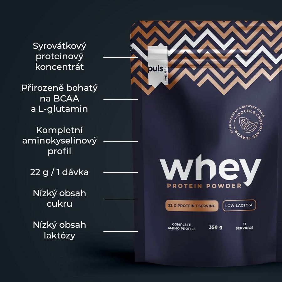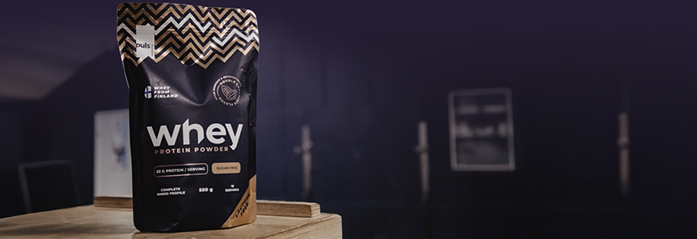 WHEY PROTEINProteinový prášek pro přípravu nápoje, se sladidlem. SEVERSKÁ KVALITA BEZ KOMPROMISU Vychutnejte si bohatou chuť dvojité čokolády a zároveň zásobte své svaly 22 g bílkovin. Protein je tvořený vysoce kvalitním syrovátkovým proteinovým koncentrátem a je navržený tak, aby podporoval růst a udržení svalové hmoty a urychlil regeneraci po tréninku. Whey Protein se pyšní kompletním aminokyselinovým profilem, který pomáhá efektivně obnovovat svalovou tkáň po fyzické zátěži. Hlavními benefity jsou fantastická chuť, nízký obsah laktózy, nízký obsah cukru, skvělá rozpustnost a jemná textura. Pro co nejefektivnější regeneraci zvažte kombinaci s PULS EAA během tréninku, maximalizujete tak ochranu svalové hmoty. Žádné kompromisy z hlediska jedinečné chuti, čistoty a složení. Finská značka PULS NUTRITION patří ve všech ohledech k absolutní špičce sportovní a doplňkové výživy. Severská kvalita Syrovátkový proteinový koncentrát Jedinečné chuťové parametry 22 g na 1 dávku Kompletní aminokyselinový profil Bohatý na BCAA a L-glutamin Nízký obsah laktózy Nízký obsah cukru Výborná rozpustnost Příchuť dvojitá čokoláda PULS NUTRITION - FUEL FOR THE PASSIONATE ONES O značce Inspirujeme naše zákazníky, aby v každodenním životě dělali ta nejlepší rozhodnutí. PULS vznikl ve Finsku z potřeby skloubit hektický a aktivní životní styl se zdravou a výživnou stravou. V PULS věříme, že sportovní výživa a nápoje nejsou určeny jen vrcholovým sportovcům. Pokud se používají správně, mohou fyzicky i psychicky prospět každému, kdo potřebuje v běžném dni trochu povzbuzení nebo energetický přísun. Naše poslání Naším posláním je dodávat životu energii prostřednictvím sportovní výživy. Nabízíme chutné a funkční produkty navržené tak, aby podpořily a pomohly naplno rozvinout váš potenciál. Naše hodnoty Kvalita je naší hlavní prioritou. Chuť - Naše produkty musí vždy skvěle chutnat. V tomto směru neděláme žádné kompromisy. Zdraví a benefity - Všechny naše produkty jsou zdravější volbou. Ne všechny jsou však bez obsahu cukru, bezlepkové či veganské — protože nejsme striktní a jsme ochotni ke kompromisu, pokud přináší přidanou hodnotu. Dostupnost - Naším cílem je, aby byly naše produkty snadno dostupné — ať už ve vašem místním obchodě, nebo pohodlně online. Dostupná cena - Za kvalitní produkty není nutné utrácet jmění. Chceme nabízet nejlepší poměr ceny a kvality na trhu, aniž bychom dělali kompromisy v oblasti kvality či bezpečnosti. Balení: 350 g Dávkování: smíchejte 30 g (cca jedna odměrka) s 250 ml studené vody nebo mléka, nejlépe v šejkru. Berte 1-3 dávky denně ihned po tréninku nebo během dne mezi jídly. Balení obsahuje 11 dávek. Upozornění: skladujte v chladu a suchu, mimo dosah dětí a přímého slunce. Konzumujte maximálně 3 dávky denně. Výživové údaje: ve 100 g ve 30 g* Energetická hodnota 1573 kJ/ 376 kcal 472 kJ/ 113 kcal Tuky 4,7 g 1,4 g z toho nasycené mastné kyseliny 3 g 0,9 g Sacharidy 8,6 g 2,6 g z toho cukry 7,4 g 2,2 g Bílkoviny 72,9 g 21,9 g Sůl 0,9 g 0,3 g Laktóza 7,4 g 2,2 g *30 g odpovídá jedné dávce. Balení obsahuje 11 dávek. Složení: syrovátkový proteinový koncentrát (původ EU), nízkotučný kakaový prášek, aromata, sůl, emulgátor slunečnicový lecitin, sladidlo sukralóza.