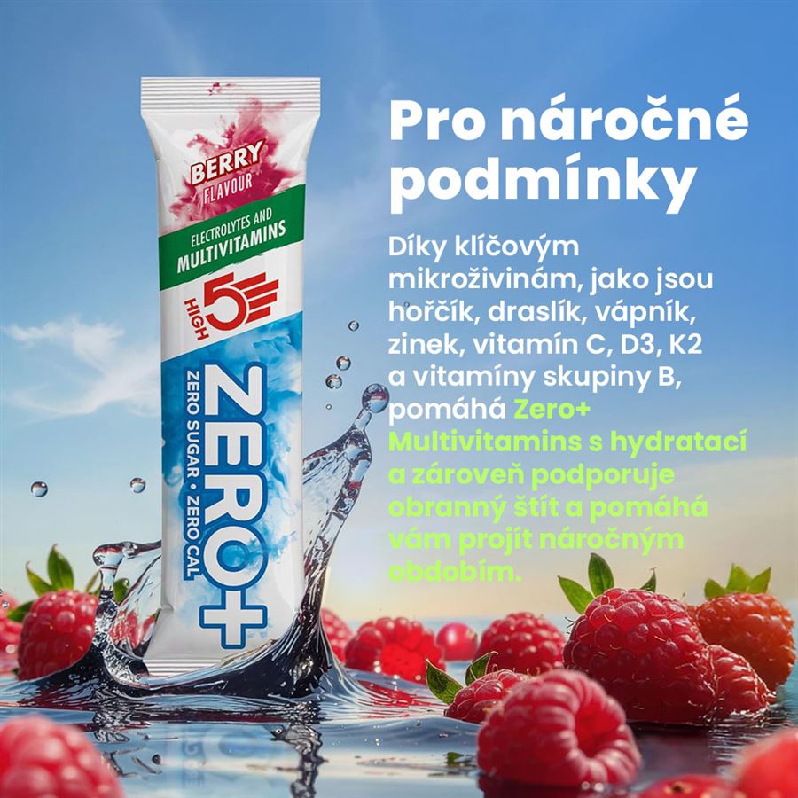 ZERO+ MULTIVITAMINS 16 x 7gDoplněk stravy. Se sladidly.Zero+ Multivitamins kombinuje celkem 22 bioaktivních složek - elektrolyty, vitamíny a esenciální minerály pro podporu energie, imunity a celkové kondice. Díky klíčovým mikroživinám, jako jsou hořčík, draslík, vápník, zinek, vitamín C, D3, K2 a vitamíny skupiny B, pomáhá Zero+ Multivitamins s hydratací a zároveň podporuje obranný štít a pomáhá vám projít náročným obdobím. Zero+ Multivitamins je ideální pro aktivní životní styl, nabitý program, každodenní trénink nebo jednoduše pro podporu celkové pohody.Při tréninku, pocení nebo během náročného dne tělo ztrácí nejen tekutiny, ale i mikronutrienty. Zero+ Multivitamins doplňuje obojí. Směs obsahuje:Elektrolyty - 300 mg sodíku, 300 mg draslíku, 150 mg hořčíku, 120 mg vápníku a 272 mg chloridů pro podporu rovnováhy tekutin, svalové funkce a hydratace.Minerály - Zinek, chrom, mangan, selen a jód.Vitamíny pro energii a imunitu - Vysoké dávky vitamínu C (200 mg / 250 % RHP) a vitamínů skupiny B (včetně B6, B12, B3, B2, B1, B5 a B9) pro snížení únavy a vyčerpání a podporu uvolňování energie.Na rozdíl od běžných mass-marketingových produktů, ZERO+ electrolytes tabs neobsahuje umělá barviva + stabilizátory, produkt je lehce doslazen steviol-glykosidy a minimalizovaným aditivem sukralózy. Hlavní benefity Hydratace + 22 vitamínů a minerálů v jednom praktickém sáčku na cesty Ideální pro každodenní použití i aktivní životní styl Doplňuje elektrolyty ztracené potem Podporuje imunitu, každodenní energii a celkovou pohodu Chrom přispívá k udržení normální hladiny glukózy v krvi Vitamín C přispívá k normální funkci imunitního systému během i po intenzivním fyzickém výkonu Hořčík, draslík a vápník přispívají k normální činnosti svalů Hořčík přispívá k elektrolytické rovnováze a ke snížení únavy a vyčerpání Vhodné pro vegetariányObsažené složky: - Sacharidy (maltodextrin) - energie, glykogen- Hořčík (citrát hořečnatý, bysglicinát hořečnatý) - nezbytný elektrolyt- Draslík (chlorid draselný), vápník (uhličitan vápenatý), chlorid (chlorid sodný), sodík (chlorid sodný) - nezbytné elektrolyty- Zinek, chrom, mangan, selen, jód - nezbytné minerály a stopové prvky, energetický metabolismus, regenerace, imunitní systém- Vitamín K2 (menachinon) - metabolismus vápníku, srdce a cévy- Vitamín D3 (cholekalciferol) - práce svalů, imunita- Vitamín B1, B2, B5, B6, B12, niacin, biotin - energetický metabolismus, nervový systém- Vitamín C, E, kyselina listová - antioxidanty Balení: 16 x 7 g (112 g) Dávkování: 7 g (celý obsah sáčku) smíchejte se 400-500 ml vody. Konzumujte 1 sáček denně. Upozornění: skladujte v suchu, chladu, mimo dosah dětí. Nepřekračujte doporučenou denní dávku. Není náhrada pestré stravy. Aktivní látky: v jednom sáčku (7 g) (% RHP*) Hořčík 150 mg (40 %*) Draslík 300 mg (15 %*) Vápník 120 mg (15 %*) Chloridy 272 mg (34 %*) Zinek 5 mg (50 %*) Chrom 20 µg (50 %*) Mangan 1 mg (50 %*) Selen 28 µg (51 %*) Jód 75 µg (50 %*) Sodík 300 mg Vitamín K2 75 µg (100 %*) Vitamín D3 25 µg (500 %*) Vitamín B6 2,8 mg (200 %*) Vitamín C 200 mg (250 %*) Vitamín E 12 mg (100 %*) Kyselina pantothenová 12 mg (200 %*) Kyselina listová 400 µg (200 %*) Vitamín B1 2,2 mg (200 %*) Niacin 32 mg (200 %*) Vitamín B2 0,69 mg (50 %*) Biotin 100 µg (200 %*) Obsahuje <0,5 g cukru/ 100 ml hotového nápoje. *% referenční hodnoty příjmu vitamínů a minerálních látek. Složení: maltodextrin, regulátor kyselosti (kyselina citrónová), hořečnaté soli kyseliny citrónové, citrát sodný, chlorid draselný, chlorid sodný, uhličitan vápenatý, vitamín C (kyselina L-askorbová), bisglycinát hořečnatý, prášek ze šťávy červené řepy, vitamín K2 (menachinon), vitamín E (D-alfa-tokoferol), vitamín B3 (nikotinamid), citrát zinečnatý, vitamín D3 (cholekalciferol), vitamín B5 (D-pantothenát vápenatý), vitamín B 12 (kyanokobalamin), vitamín B6 (pyridoxin-hydrochlorid), vitamín B1 (thiamin-hydrochlorid), síran manganatý, vitamín B2 (riboflavin), chlorid chromitý, kyselina listová, biotin (D-biotin), jodid draselný, seleničitan sodný, přírodní aromata, protispékavá látka oxid křemičitý, sladidla (steviol-glykosidy, sukralóza).